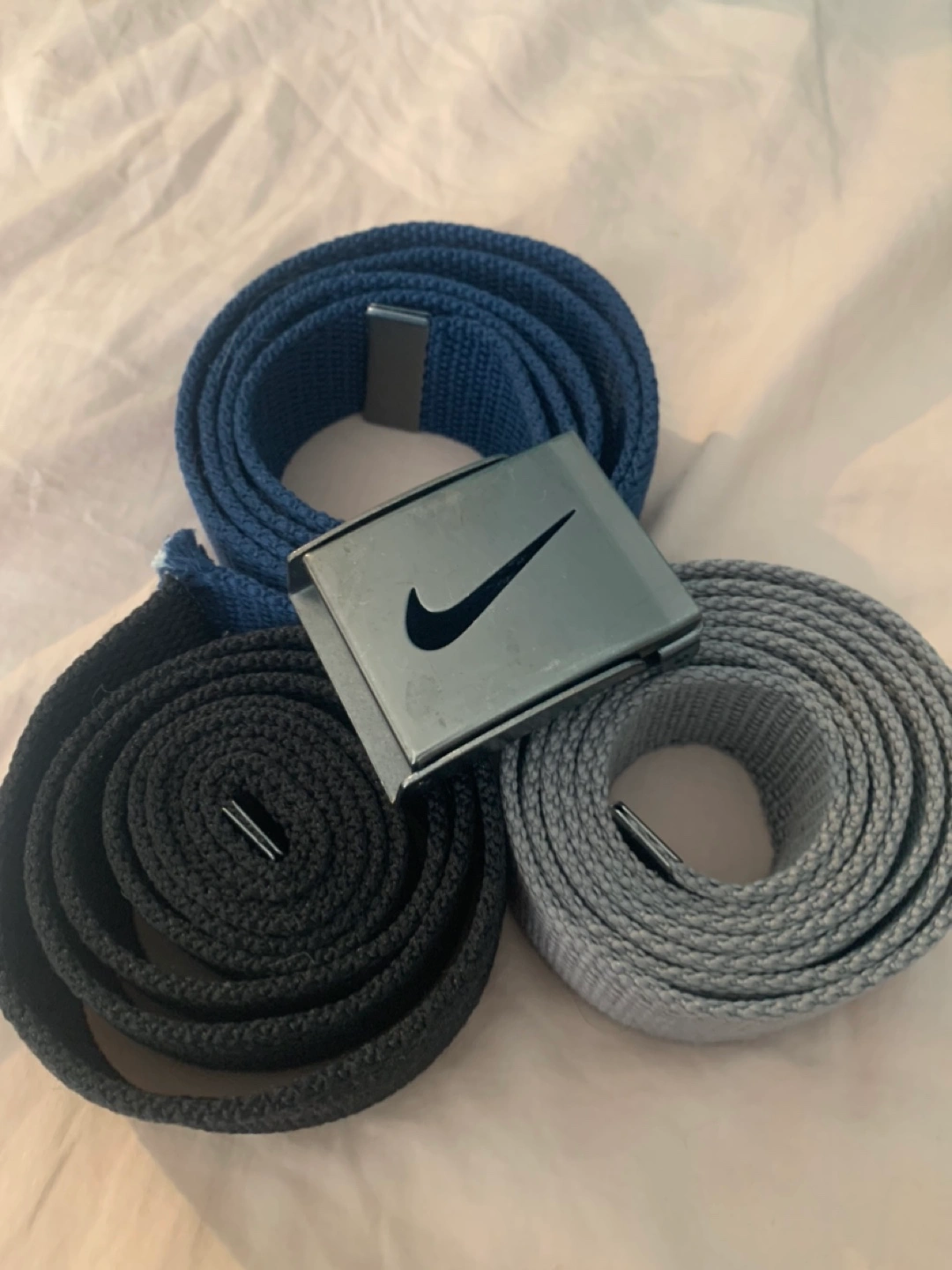 🗣️Three reversible belts in navy blue, black, and grey. Metal buckle with Nike logo.
