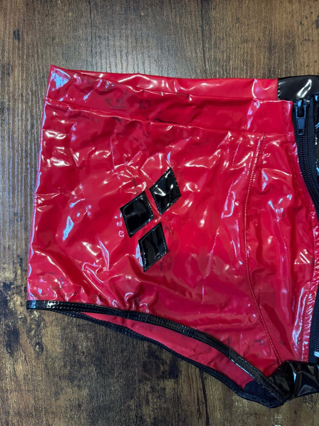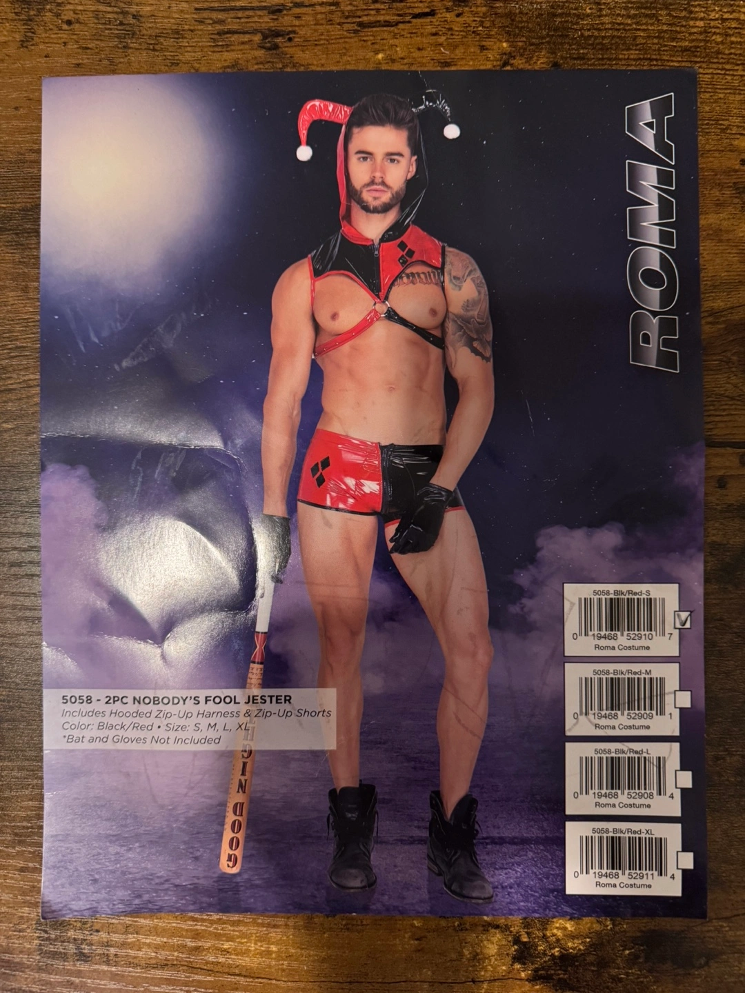 This vibrant jester costume brings character and charm, with some minor staining on the red parts that might be removable but also adds a bit of a weathered, authentic look. Please note that the bat and gloves are not included, making it a great base for your creative touches.