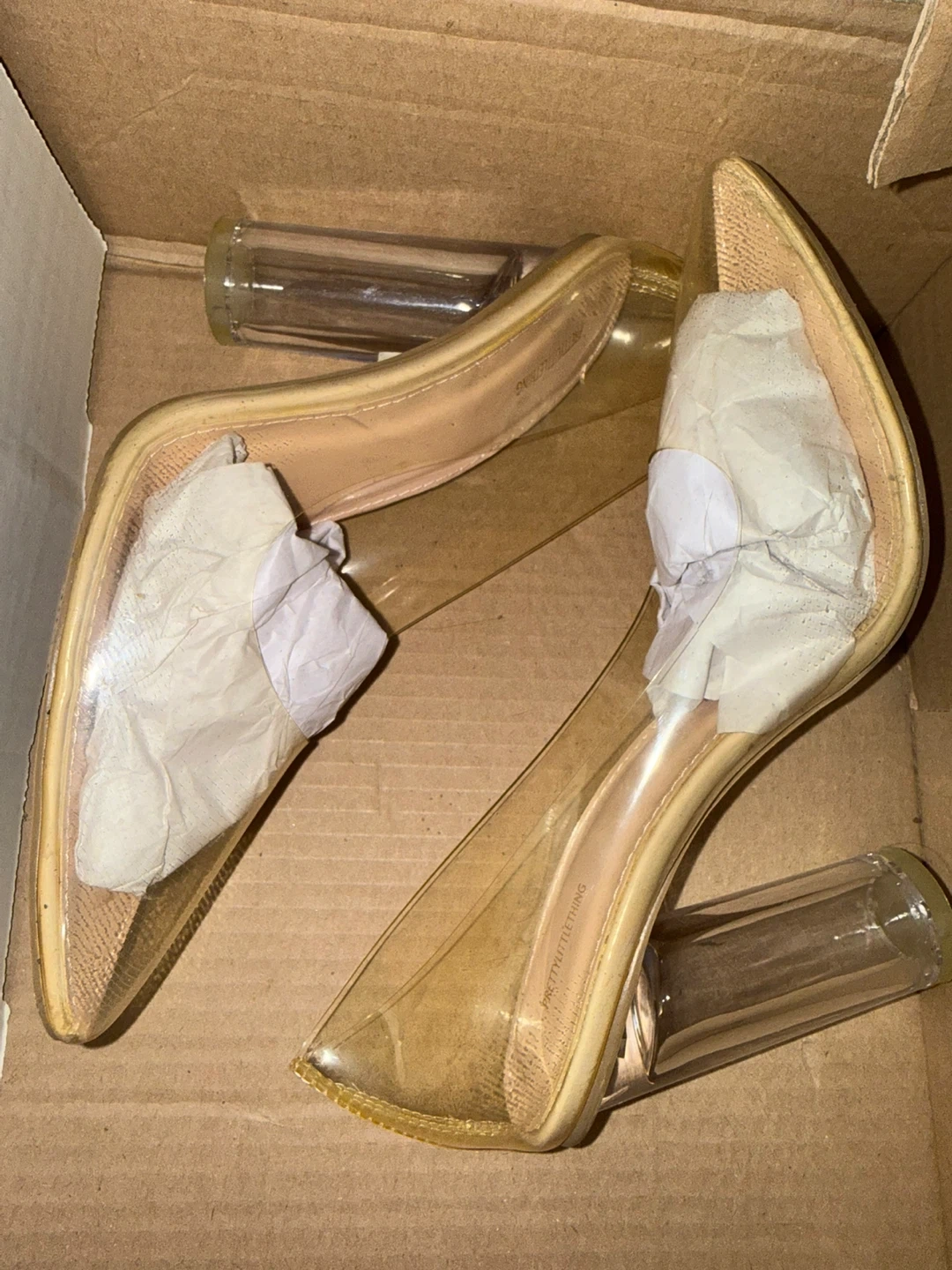 These are PrettyLittleThing nude clear block heel court shoes. They feature a clear design with nude detailing and a block heel. Size uk 5. US 7