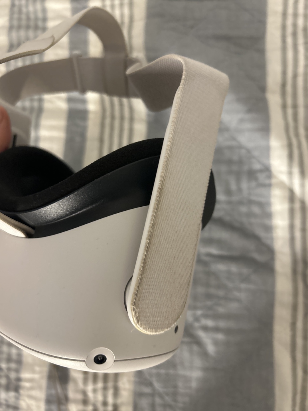White Oculus Quest 2 VR headset with two controllers. Comes with a strap. Minor wear and tear on the headset. NO CHARGER INCLUDED ‼️