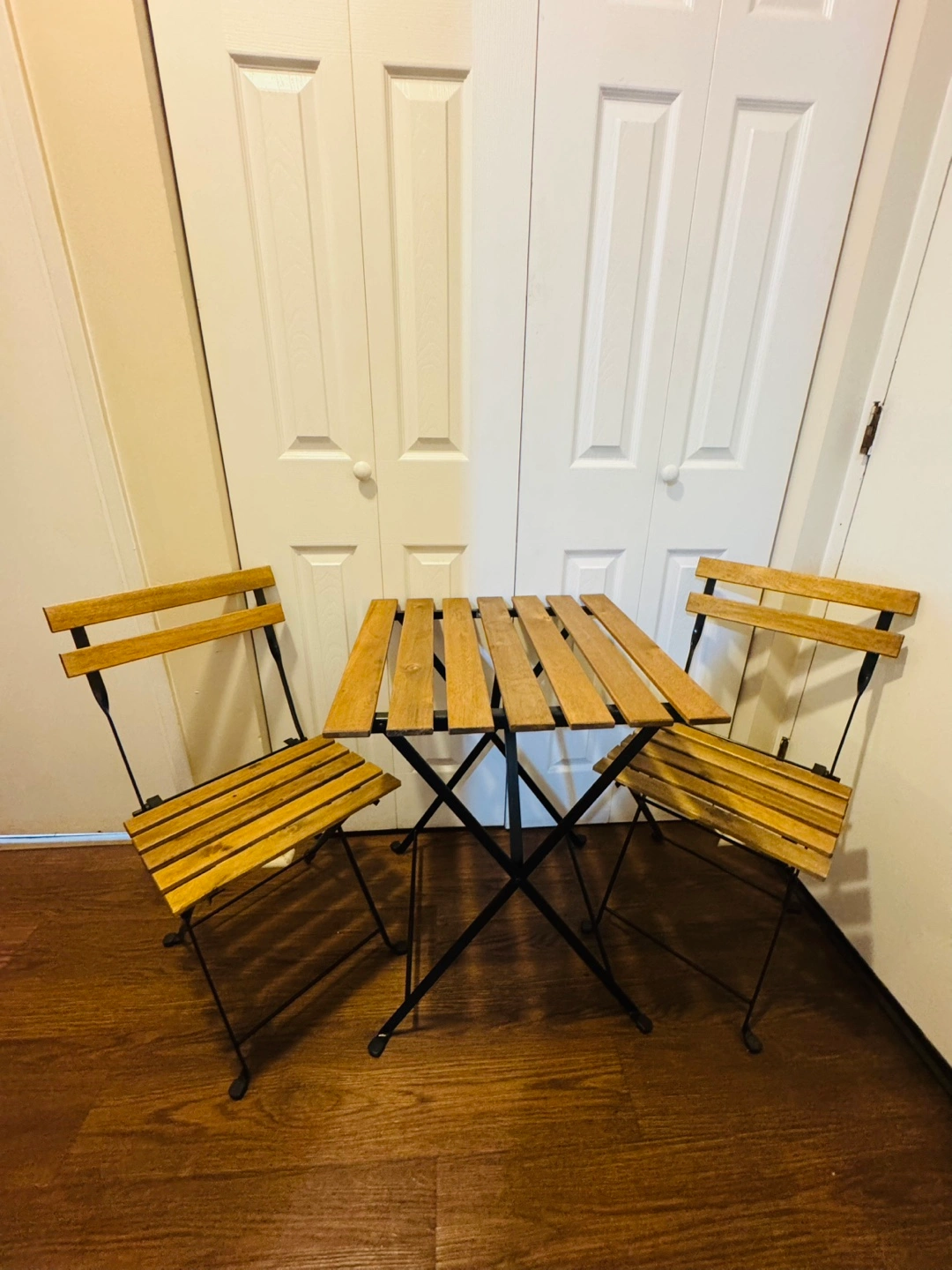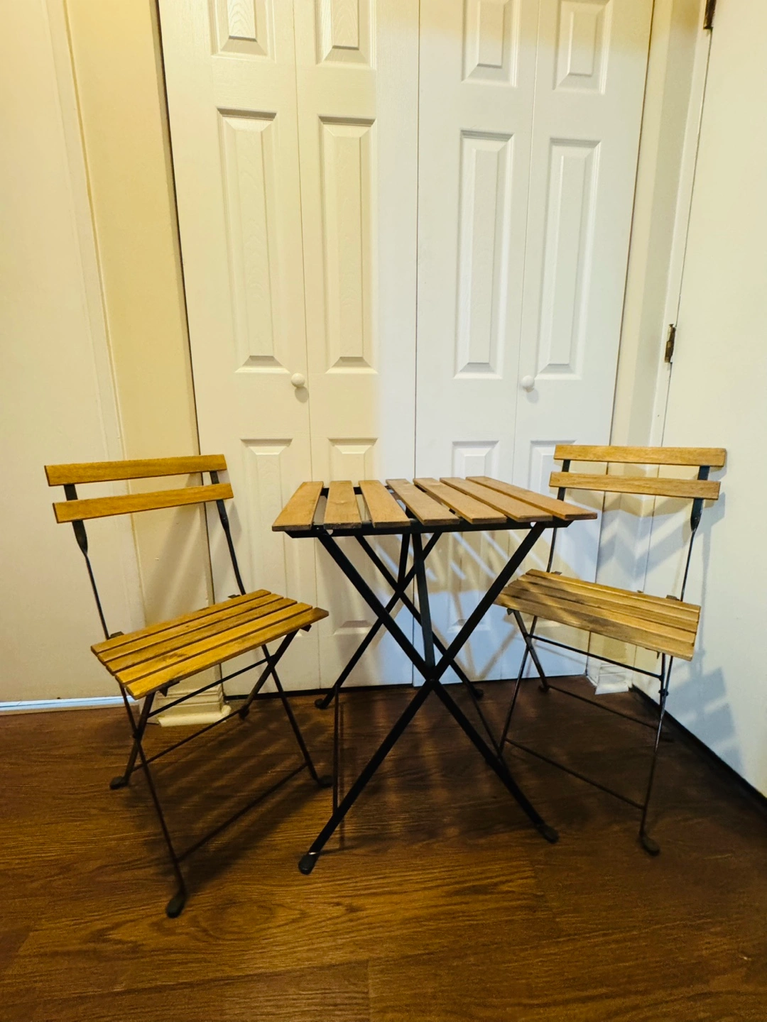 Folding table and two chairs set. Great for balconies, patios, or small spaces. Easy to store.