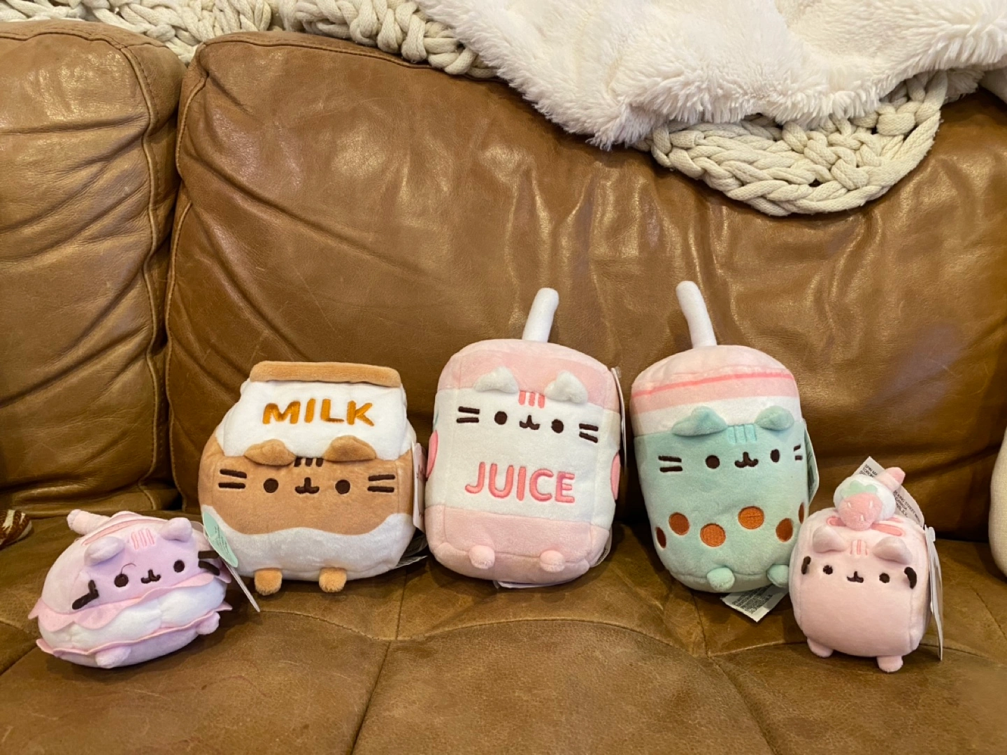 Brand new set of five Pusheen plushies. Includes milk, juice, boba tea, roll cake, and macaron.