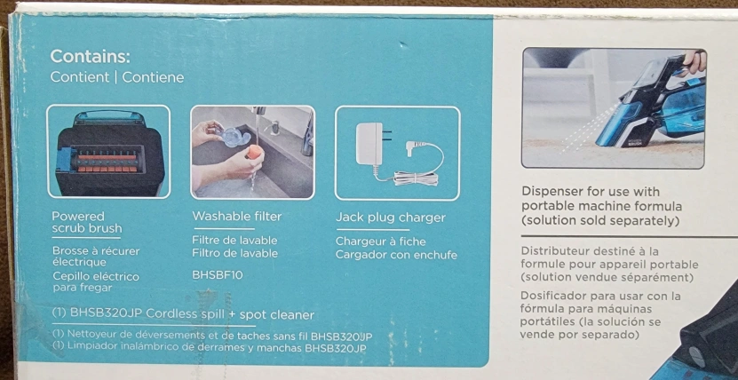 Cordless spill and spot cleaner. Picks up wet, chunky messes. Powered scrub brush to lift stains away. Dishwasher safe (top rack only) bowl and front nozzle for cleaning convenience.