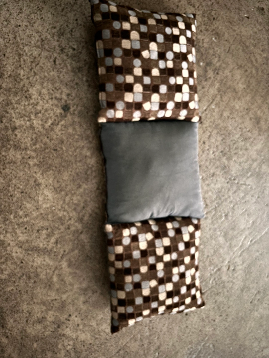Set of three decorative pillow cushions, patterned with brown, white and grey squares. Photo of the middle one shows the. Back