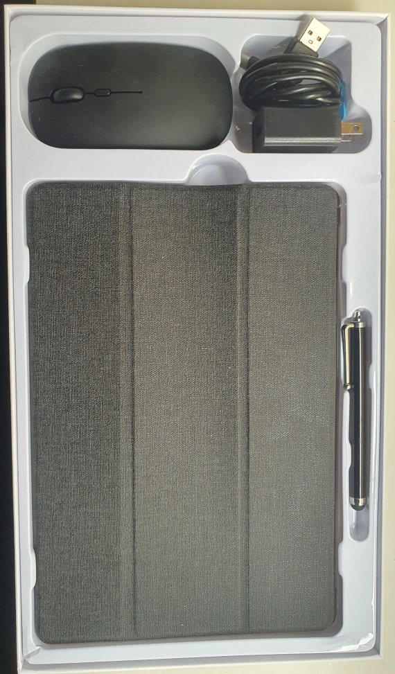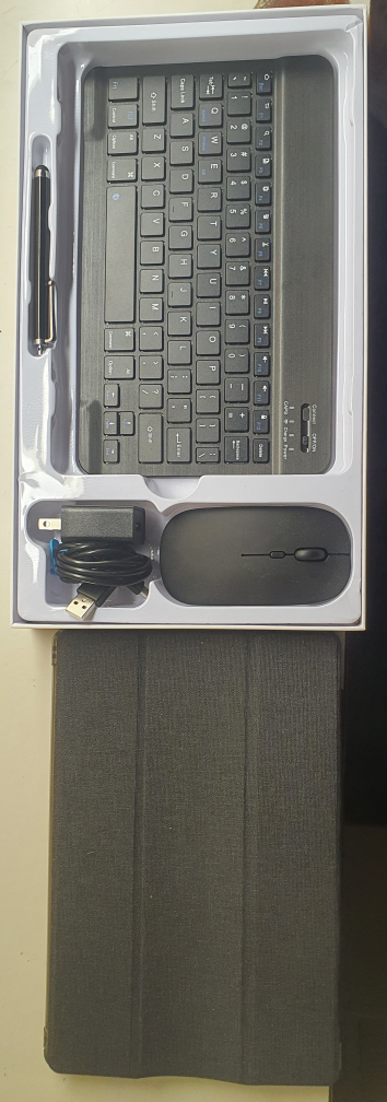 10 inch Android tablet with keyboard, mouse, stylus, and case. Includes charging cable. 64GB space, supports extension of up to 450GB.