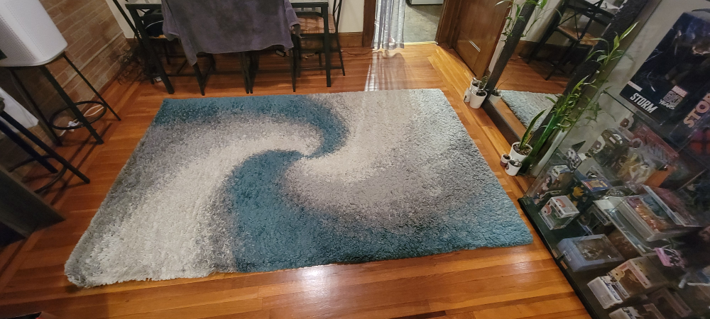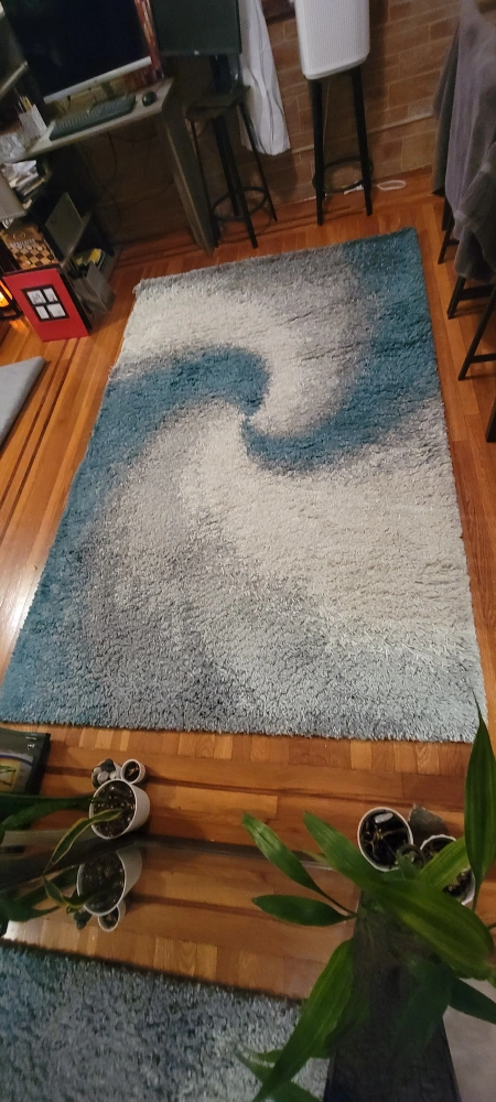 Shag rug with gray and blue colors, swirling design. it was kept in good condition. Great for a bedroom or living room.