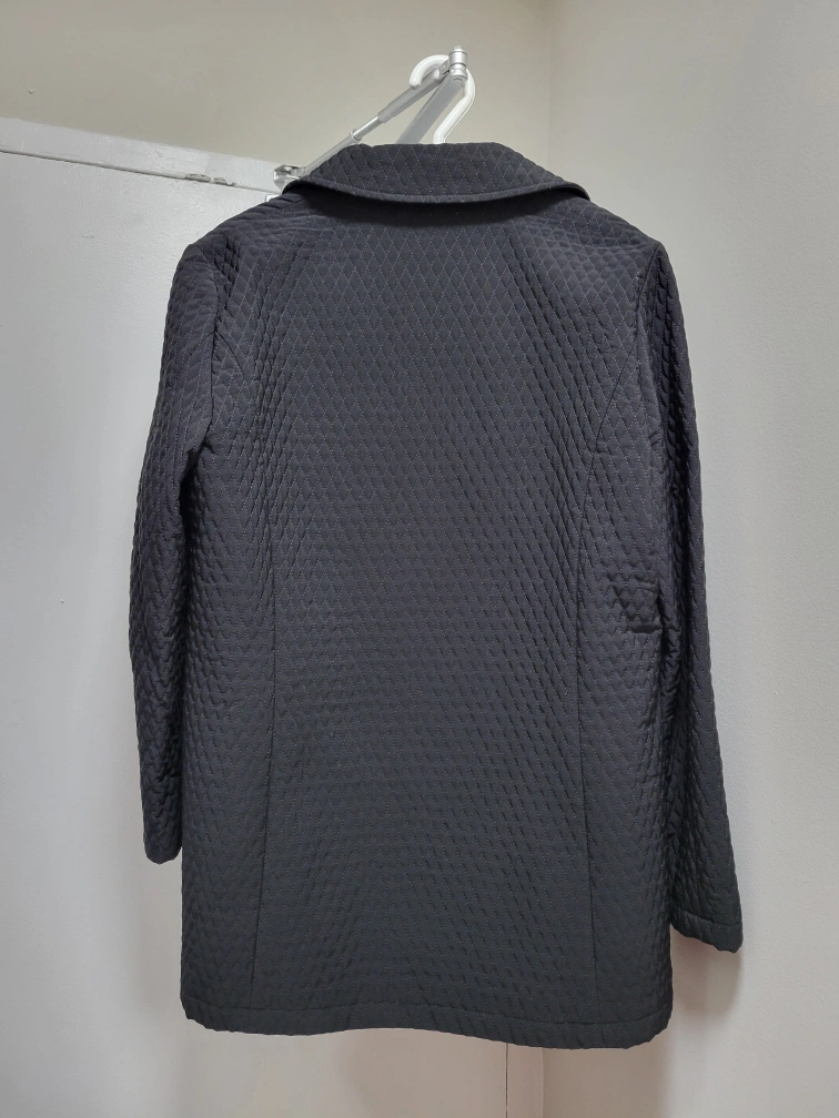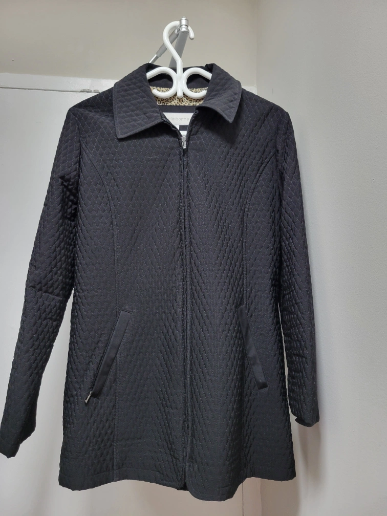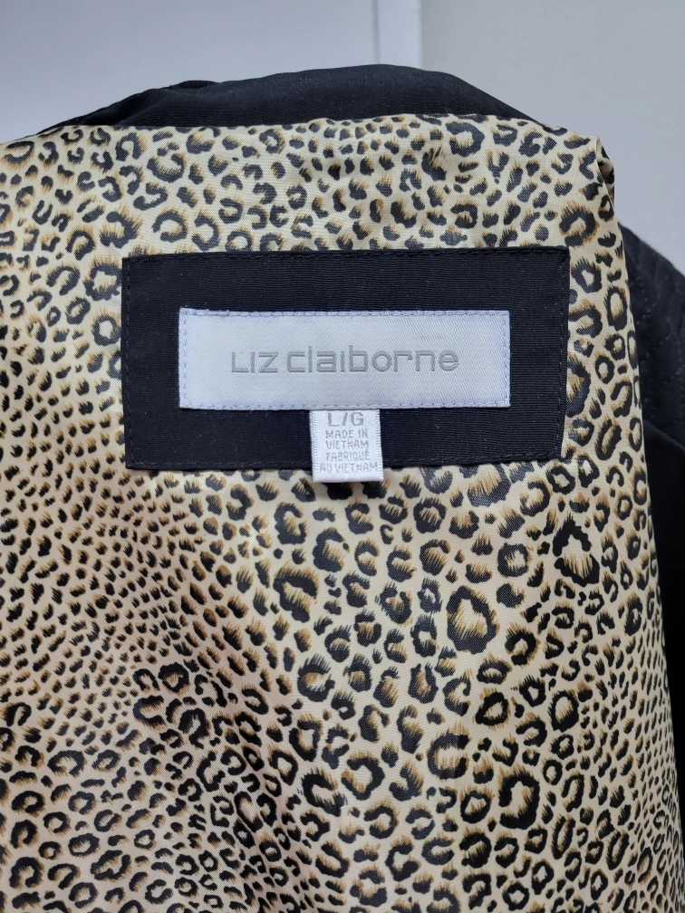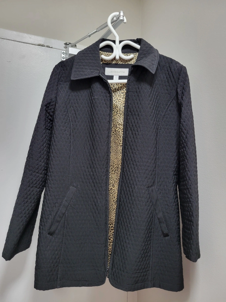 Black quilted jacket with leopard print lining. Zipper closure. Two pockets.