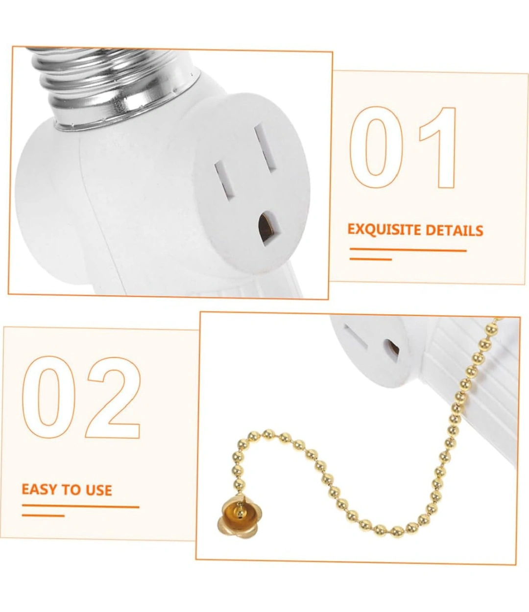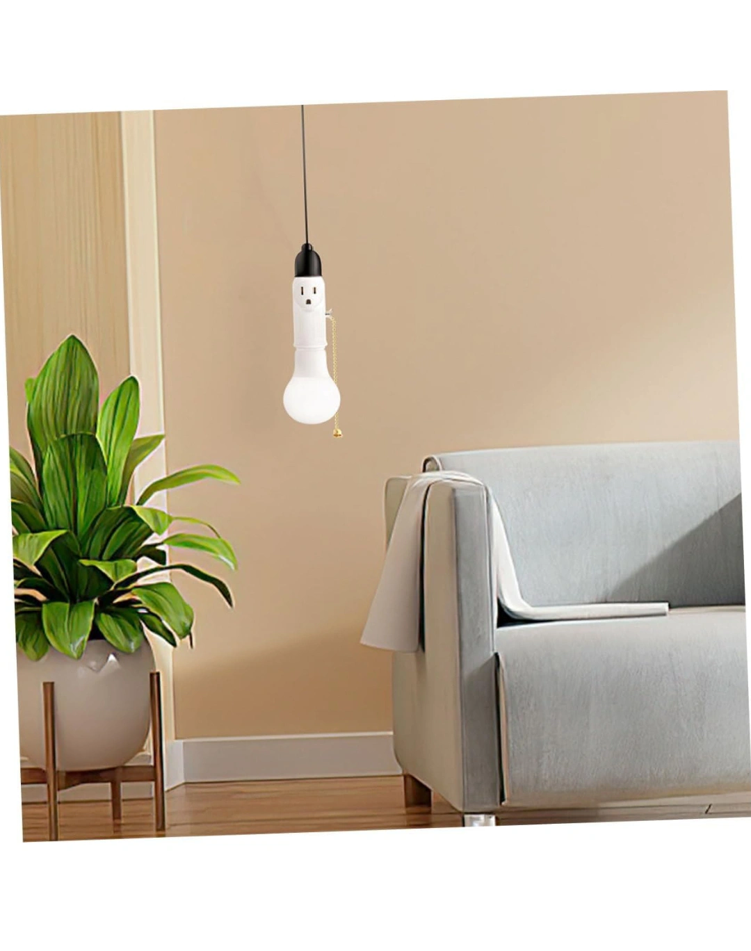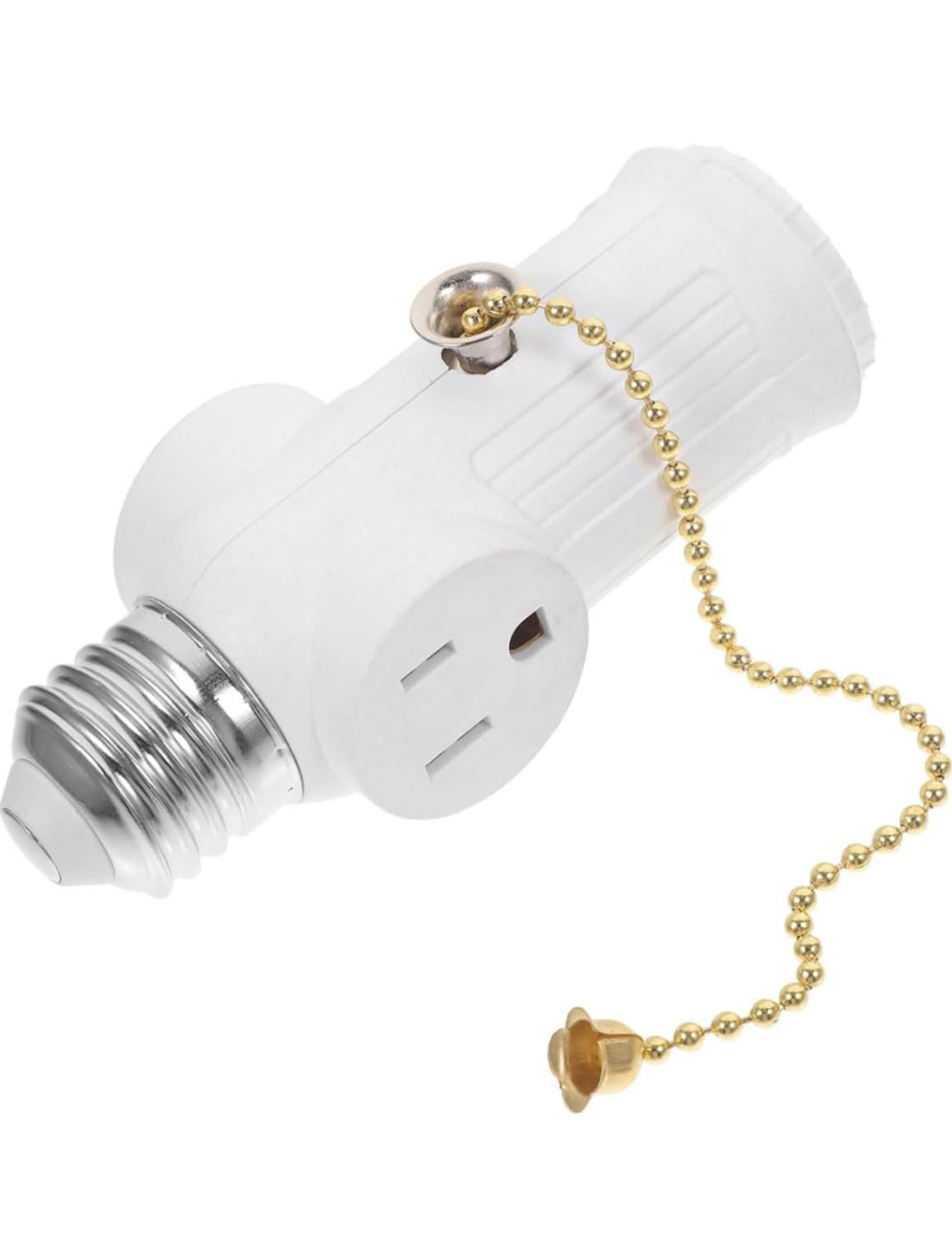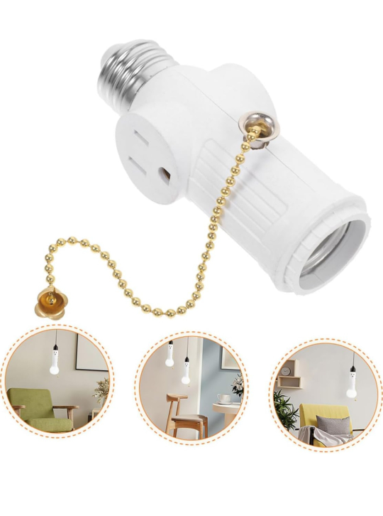 White lightbulb socket with a built-in on/off switch and a standard outlet. Has a pull chain for easy operation.