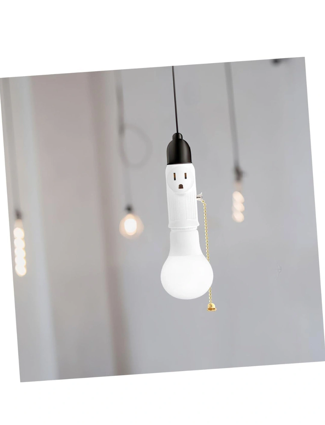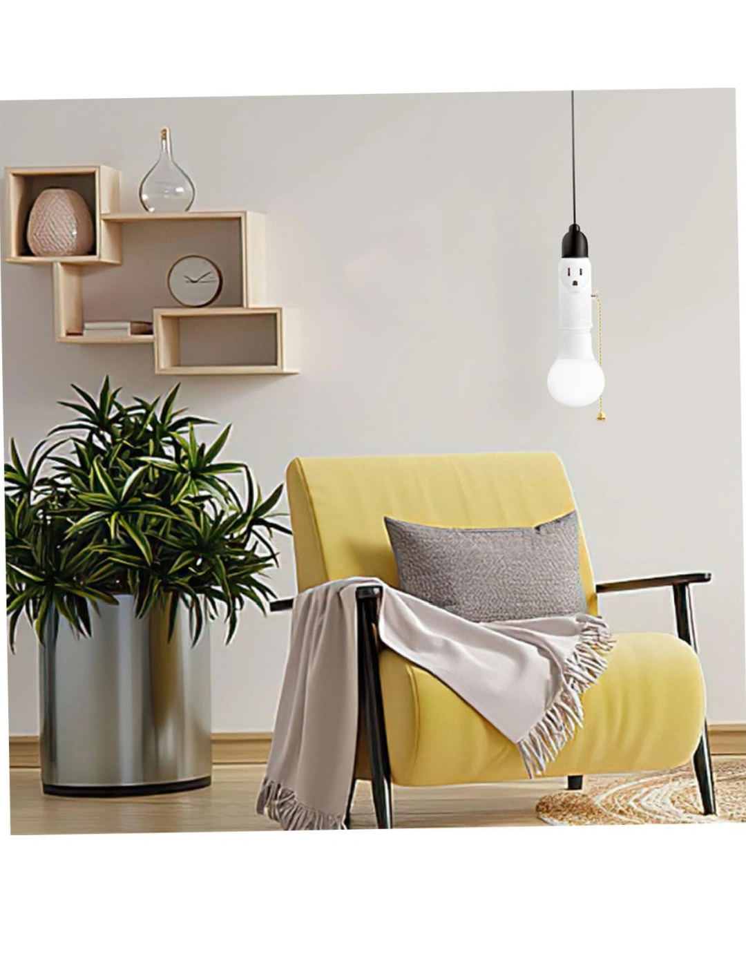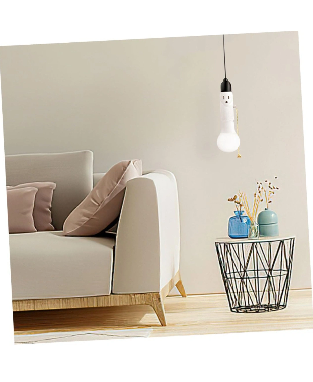 White lightbulb socket with a built-in on/off switch and a standard outlet. Has a pull chain for easy operation.