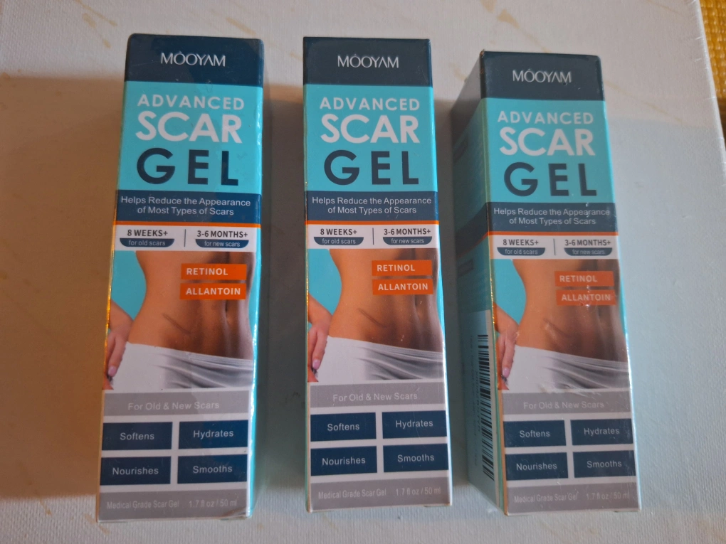 4 x unopened tubes of MOOYAM Advanced Scar Gel. Helps reduce the appearance of most types of scars. Contains retinol and allantoin. 1.7 fl oz / 50 ml. 3 for $15 6 for $25