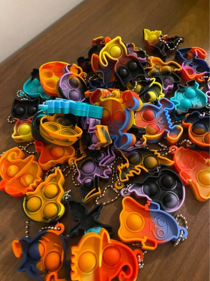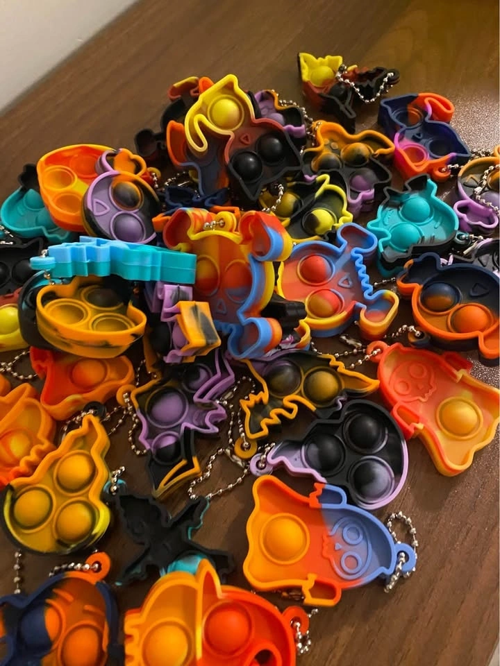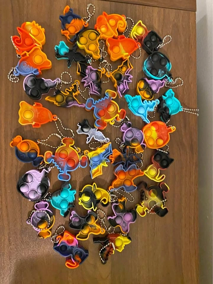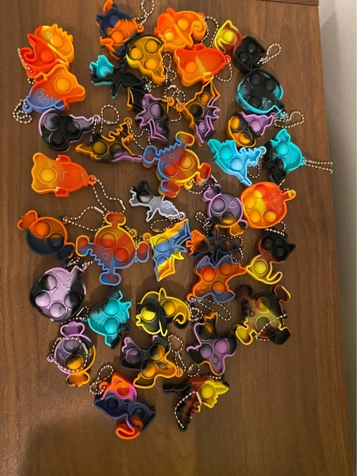 Halloween themed fidget pop it toys. Lots of different shapes and colors. Has metal keychain ring. Great for kids party favors or for kids that love fidget toys. All new, never used.