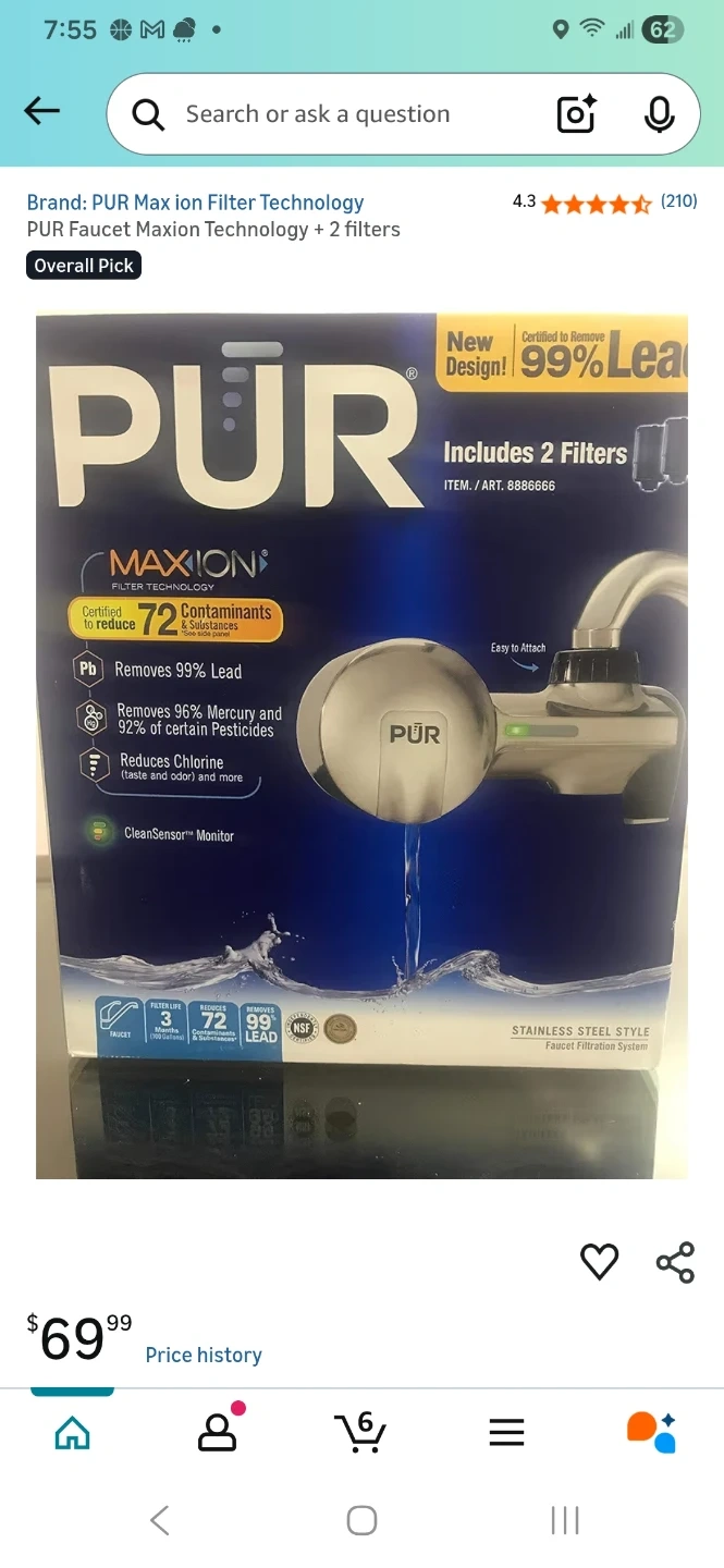 This PUR Faucet Max Ion filtration system attaches easily to your faucet. It's certified to reduce 72 contaminants and substances, including 99% of lead, 96% of mercury, and 92% of certain pesticides. It also reduces chlorine taste and odor. Includes a CleanSensor Monitor to indicate filter life.