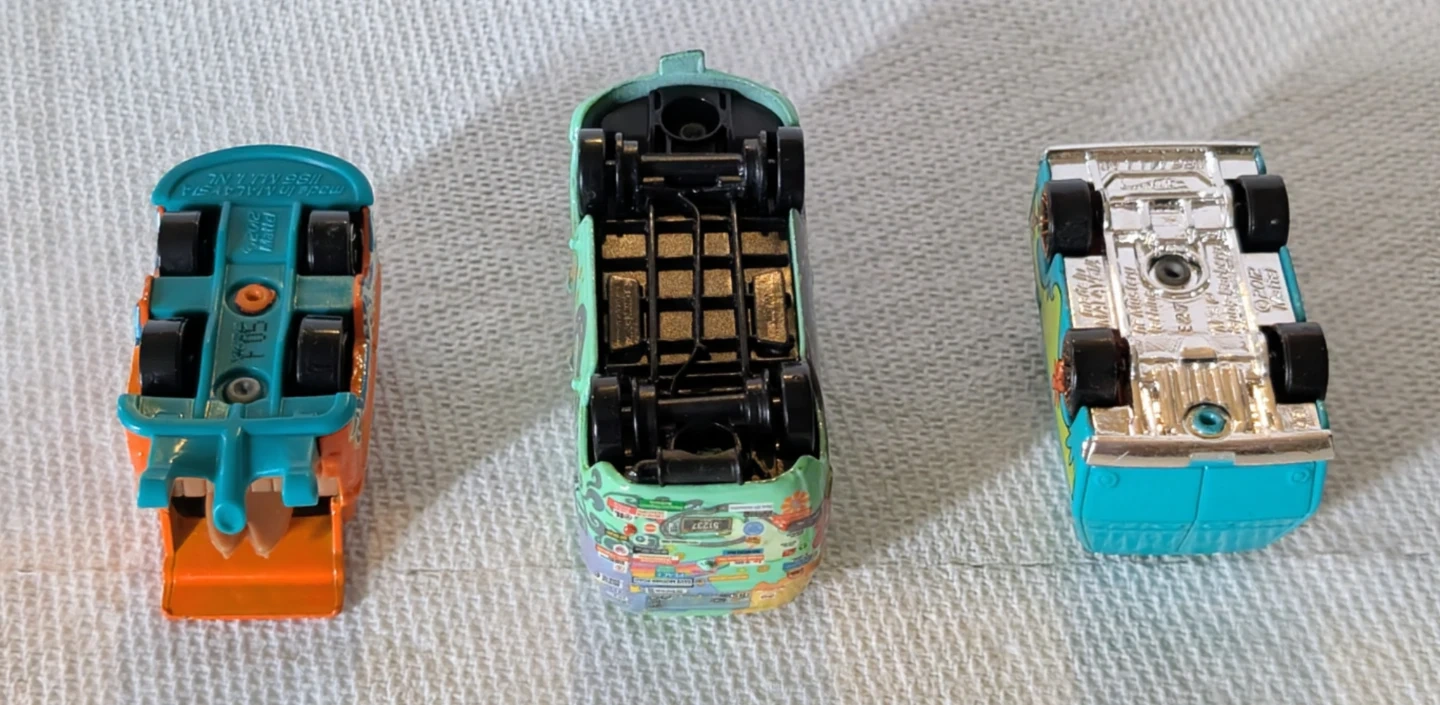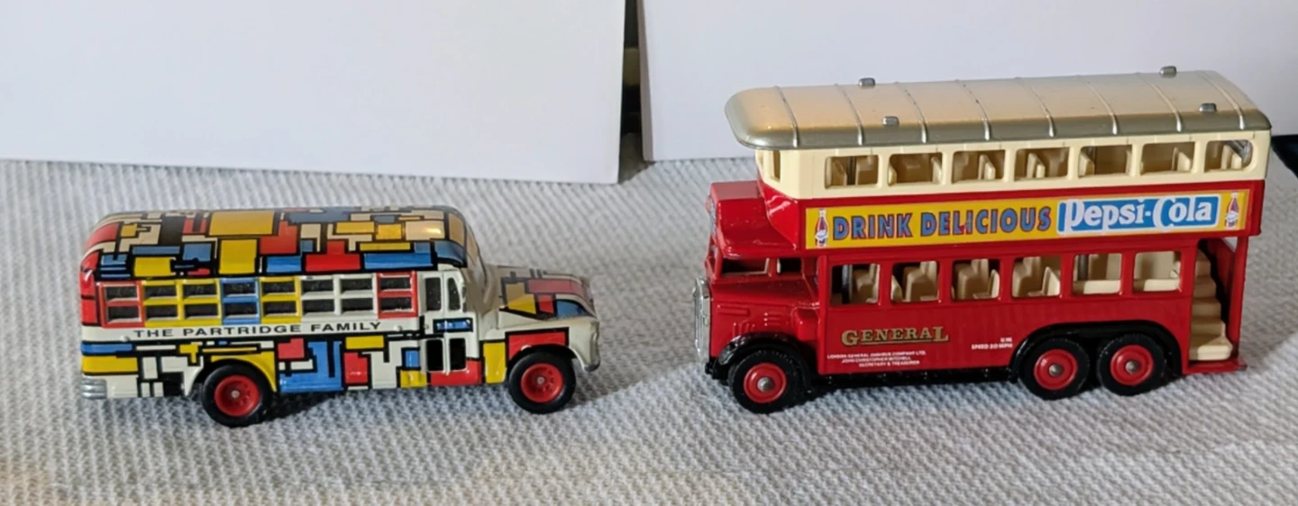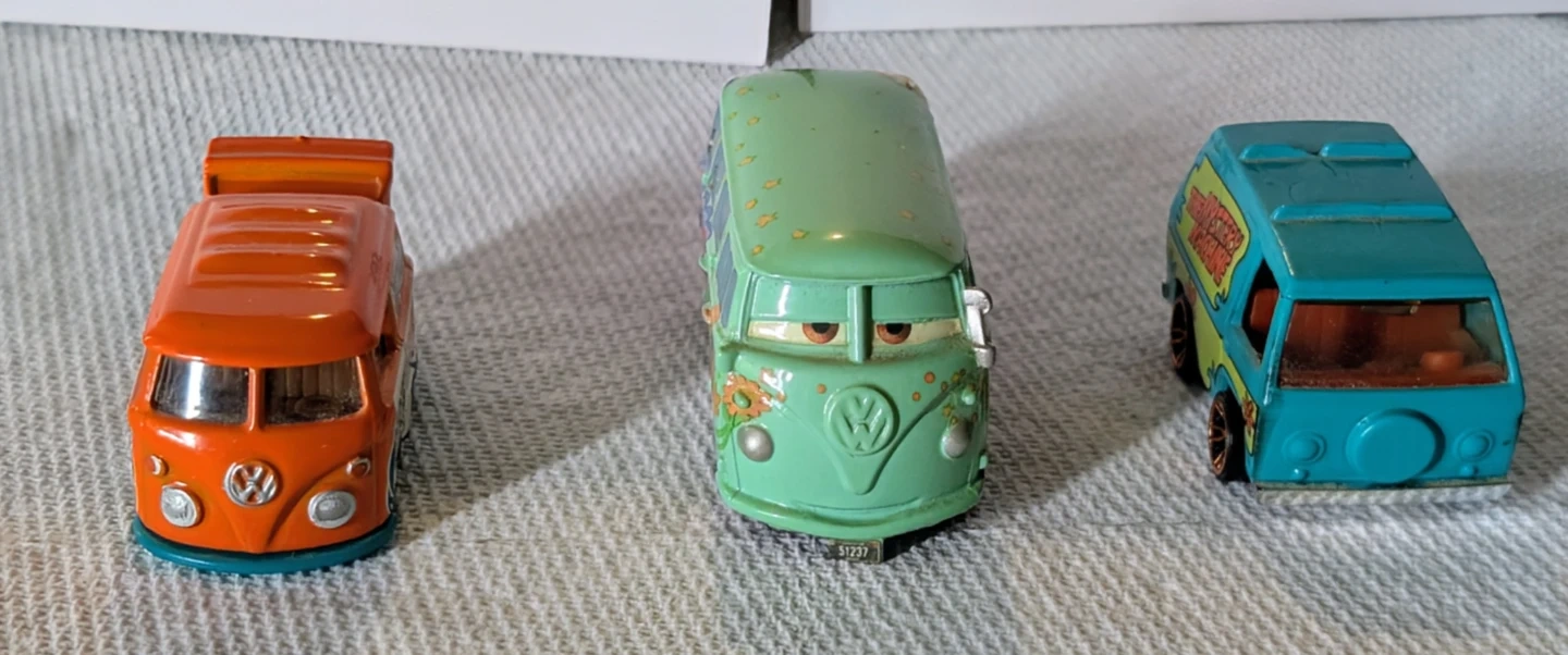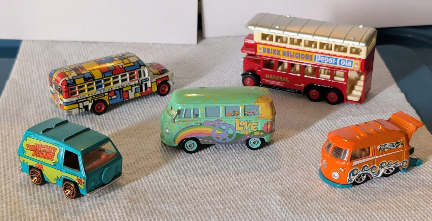 This is a lot of five die cast toy vehicles including a Pepsi double-decker, a Partridge Family bus, and three VW-style vans. The green van has eyes and appears to be from the 'Cars' franchise, while the teal van has 'The Mystery Machine' text.