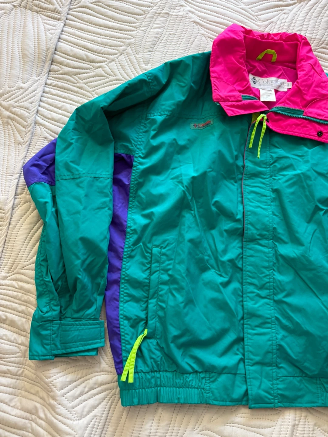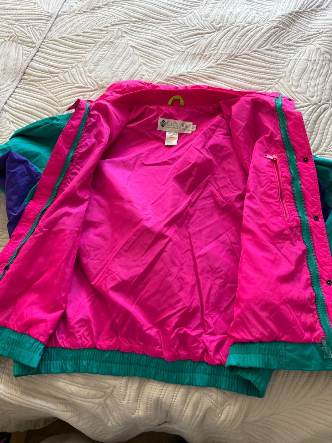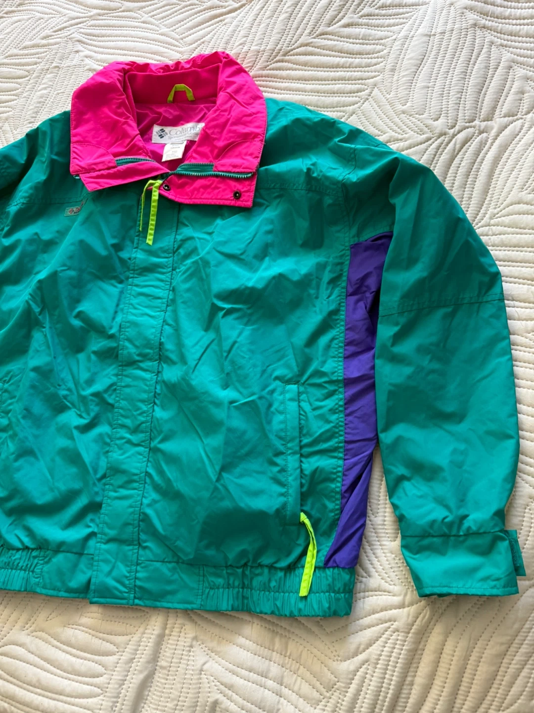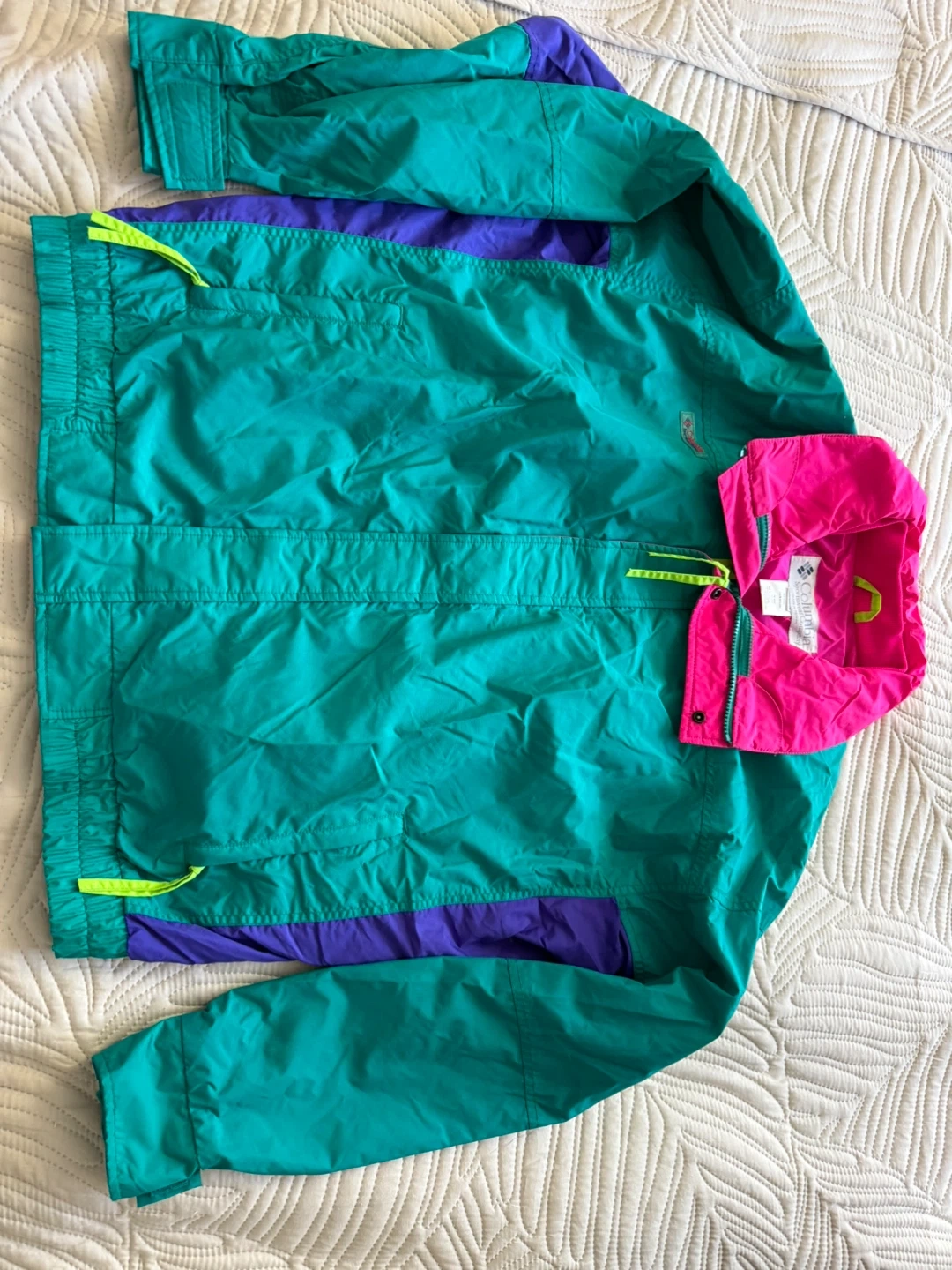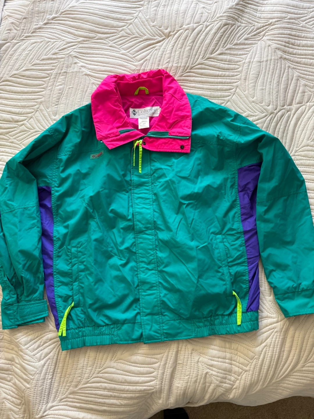 This Columbia Sportswear jacket is made of 100% nylon. It features a bright color-block design with teal, purple, and hot pink accents. Zip front with a stand-up collar. It's a size small.