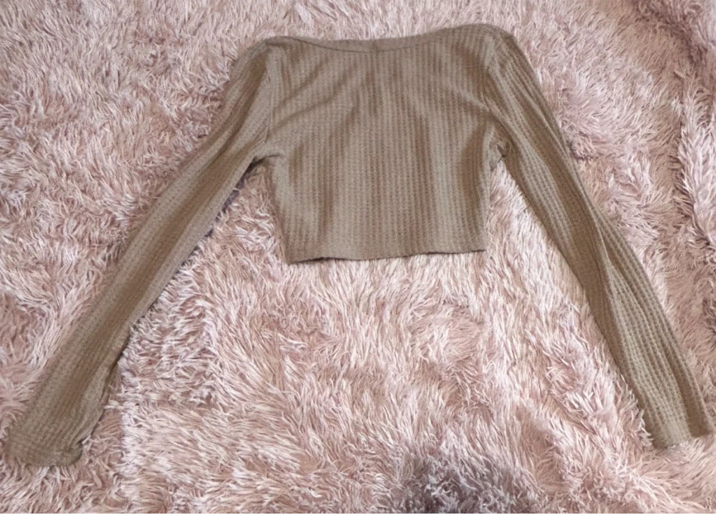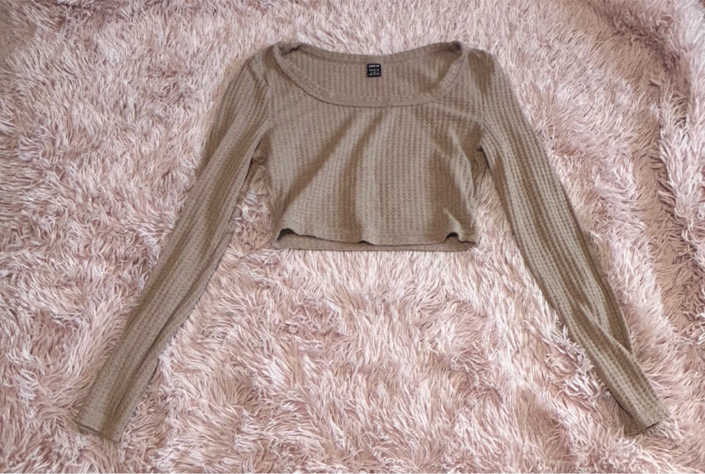 This is a long-sleeve cropped top from SHEIN. It features a textured waffle knit fabric and a scoop neckline. It's a versatile piece that can be dressed up or down.