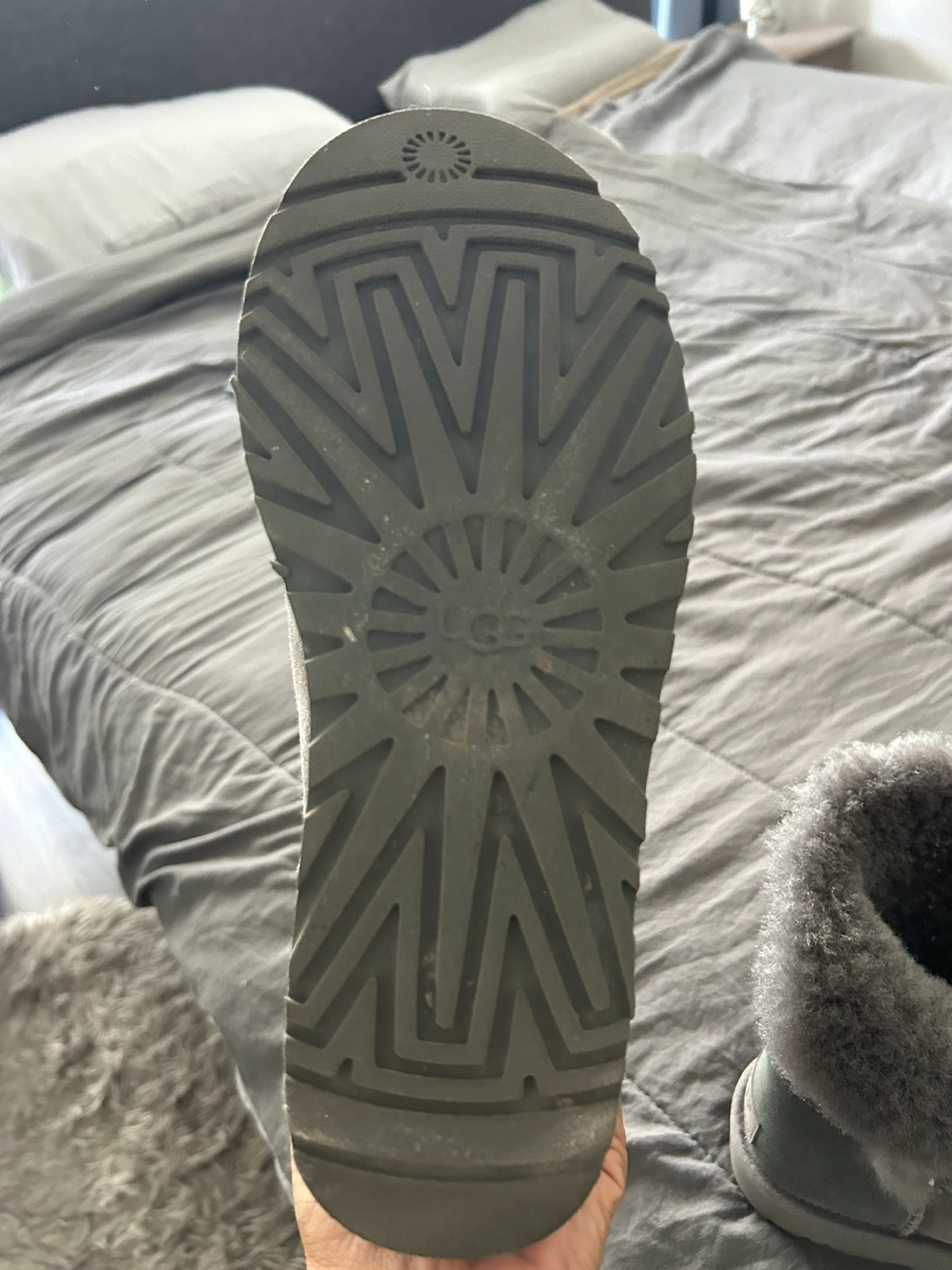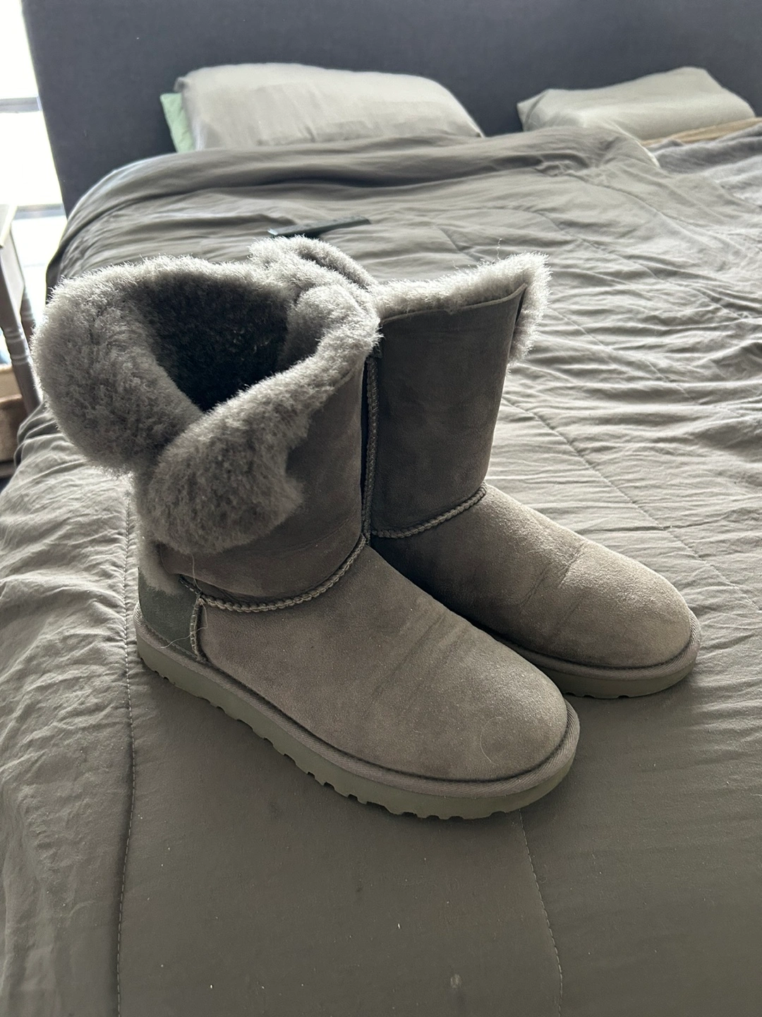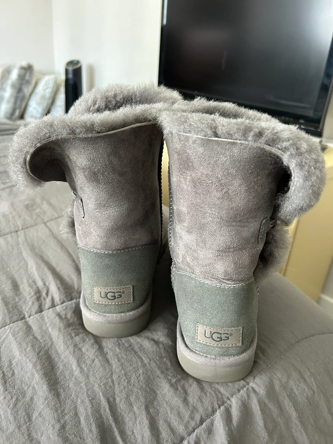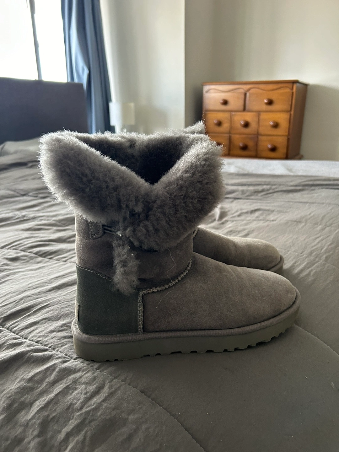 Grey suede boots with a sheepskin lining and a classic UGG sole. Fold-over cuff with a tie.