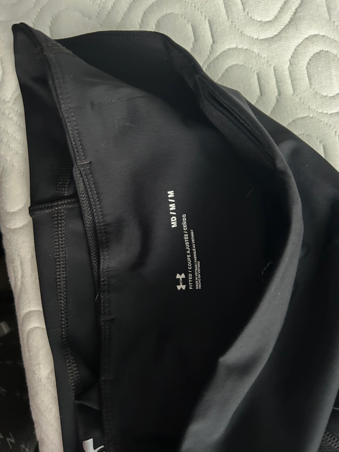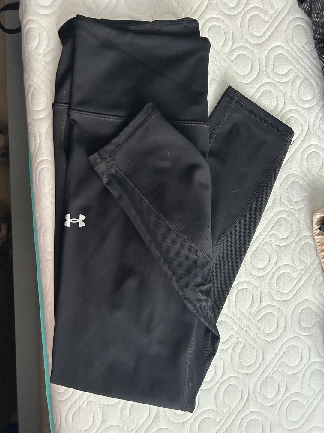 Black leggings with a high waist and mesh panels. Size: Medium. Brand Under Armour. Tried on but did not fit so never worn. $15