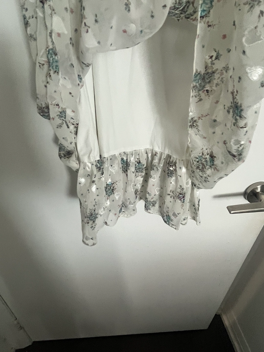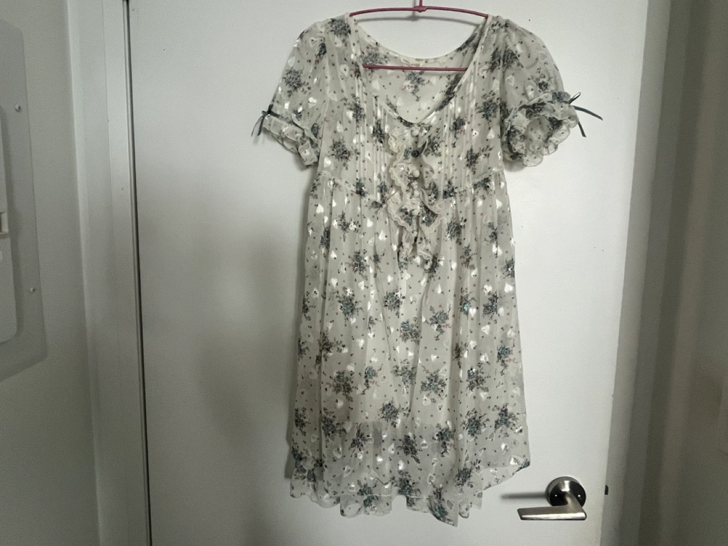 White floral dress with short sleeves and a ruffled hem. Made of sheer material.