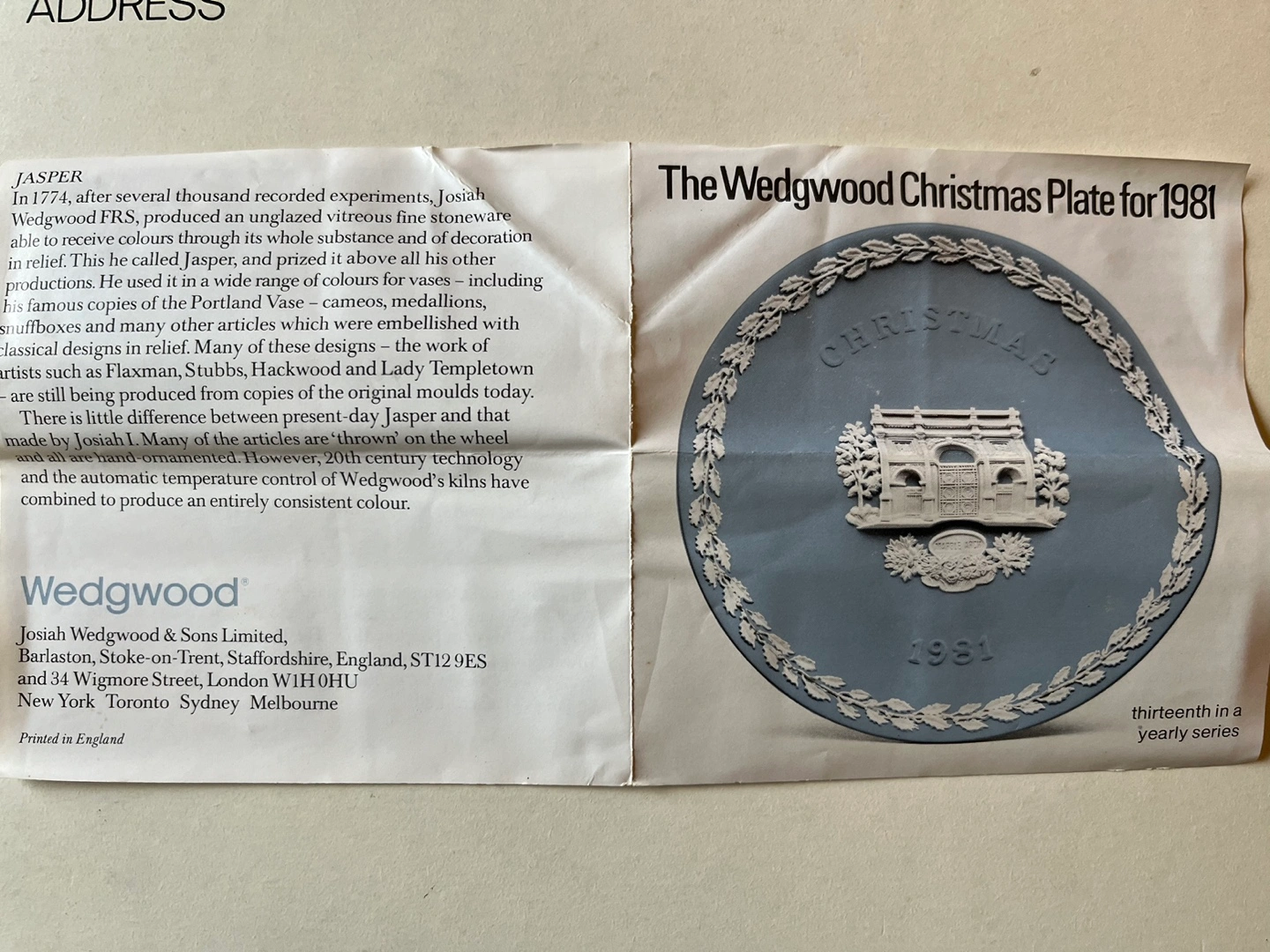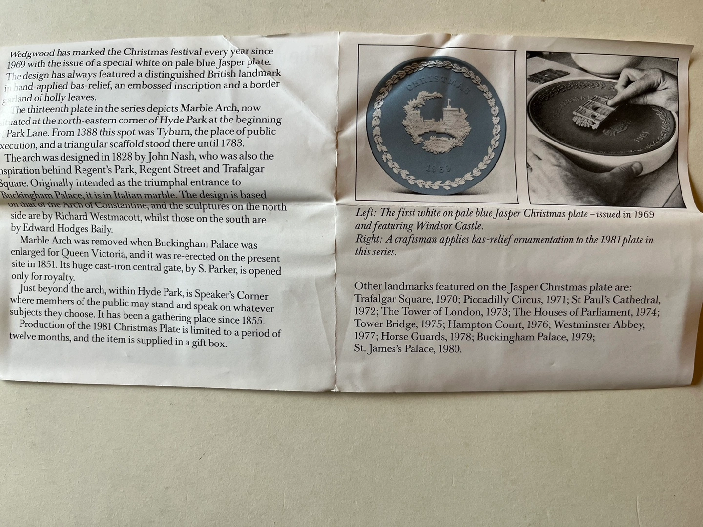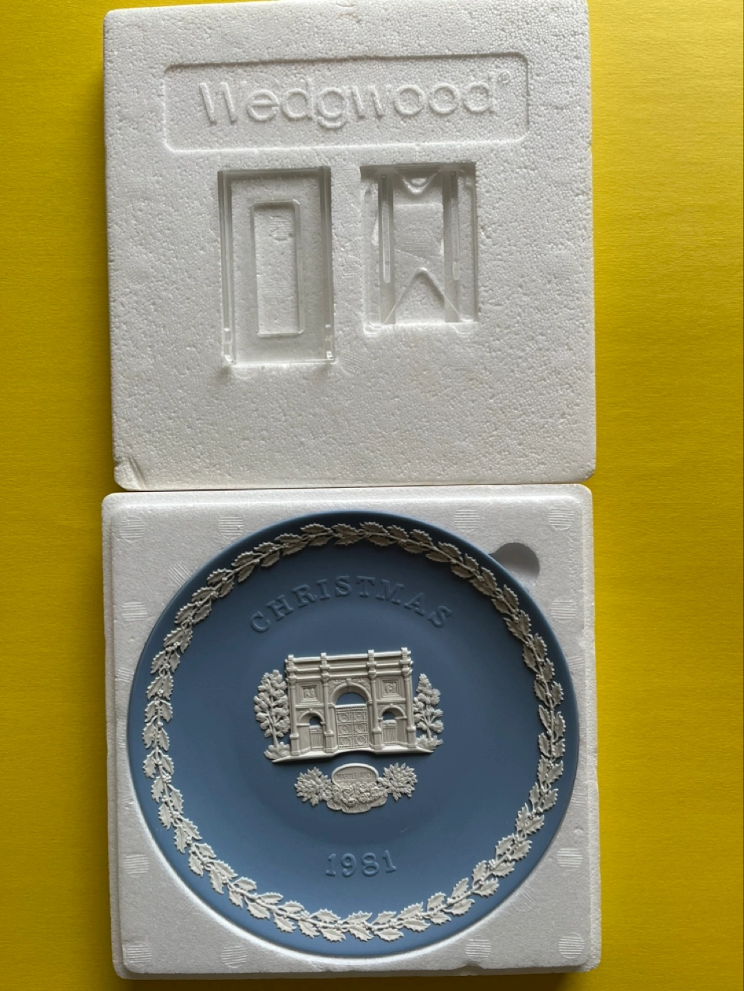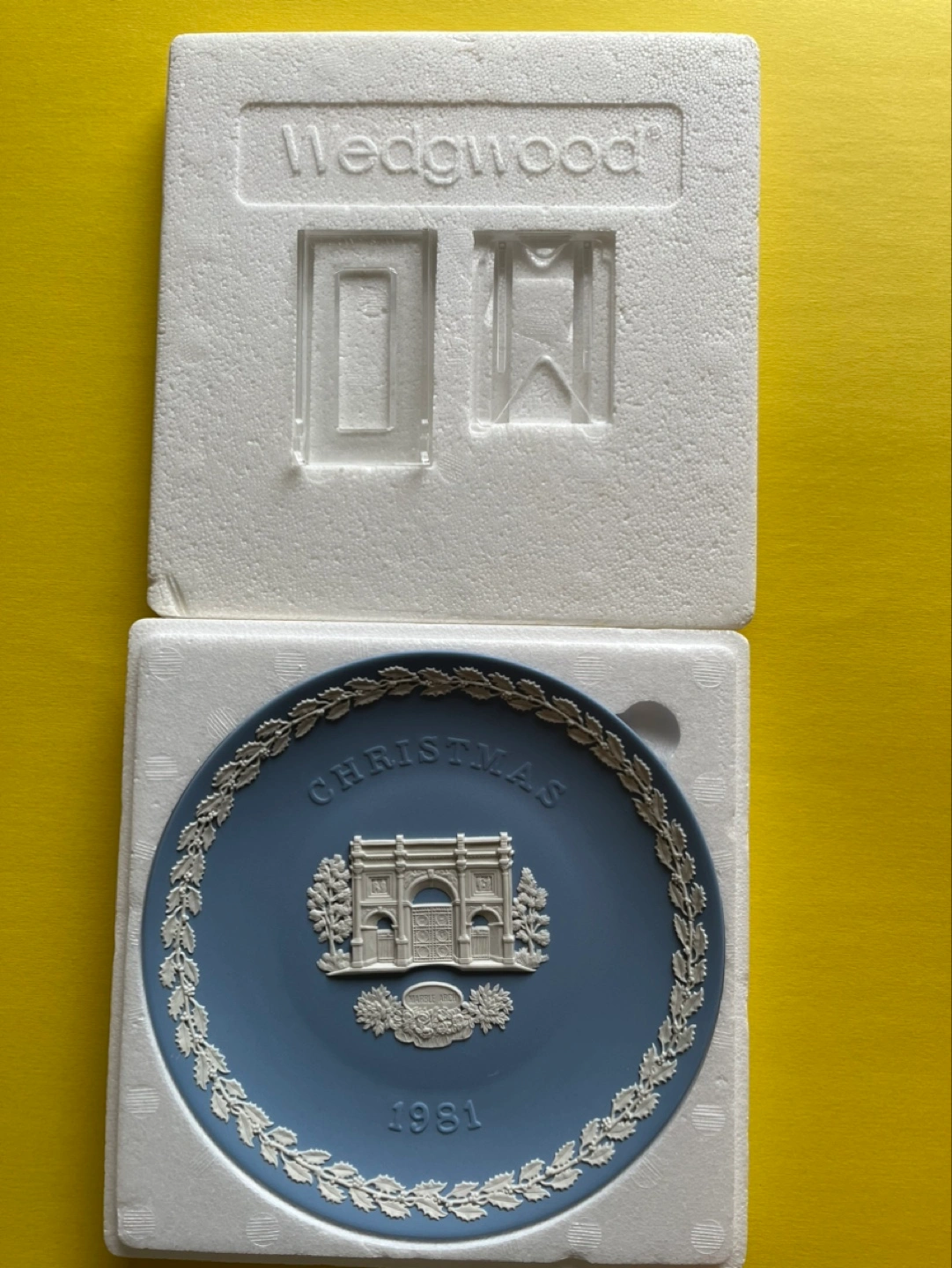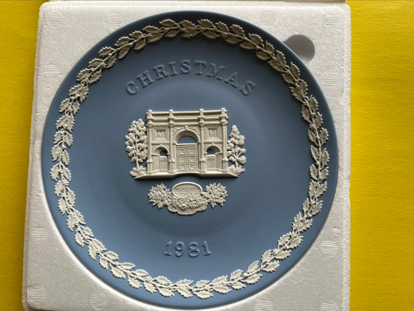 Authentic Wedgwood blue jasperware Christmas plate 1981, featuring Marble Arch. This is the thirteenth in a yearly series since 1969. The design features a distinguished British landmark each year. Comes in original box with a display stand. Made in England.