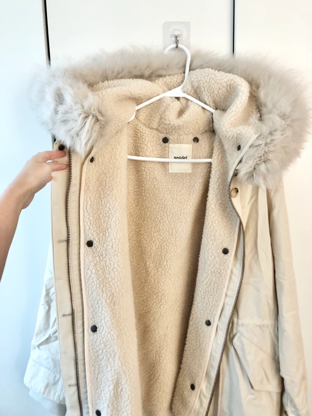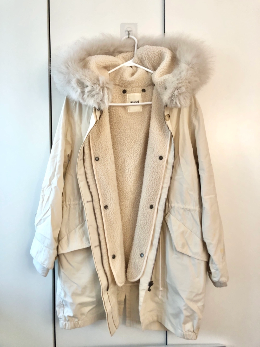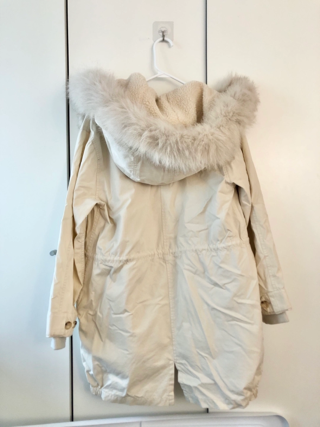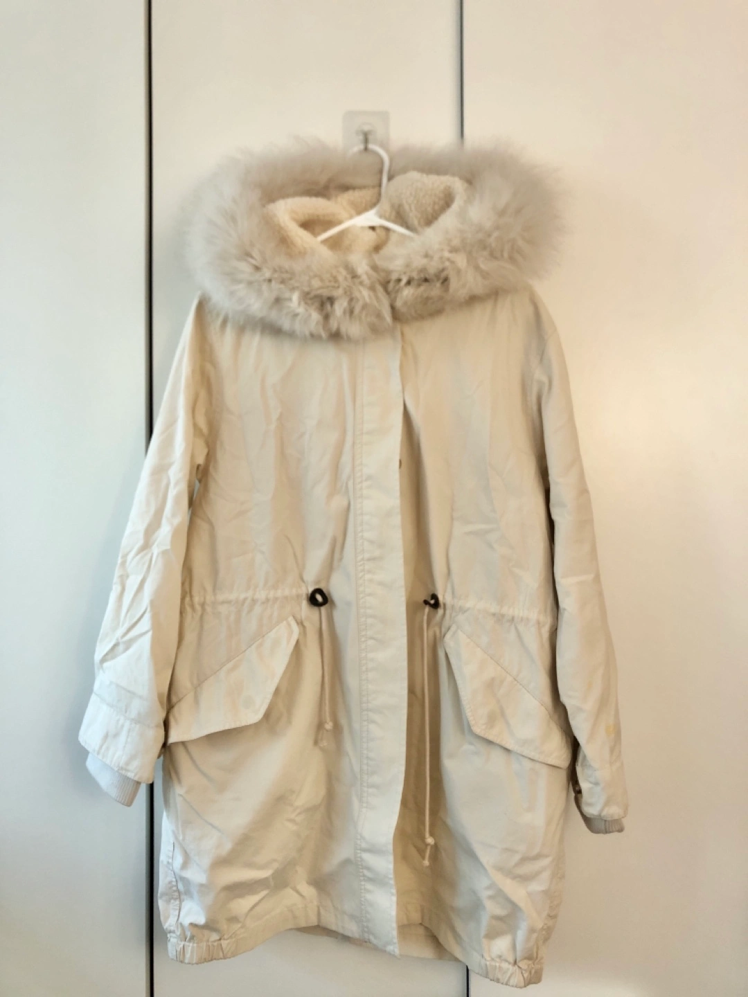 Long white winter coat with fur hood