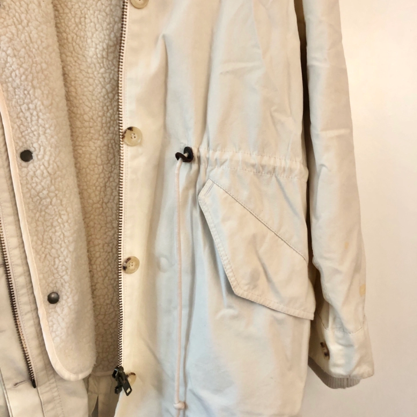 zip up and button closure.