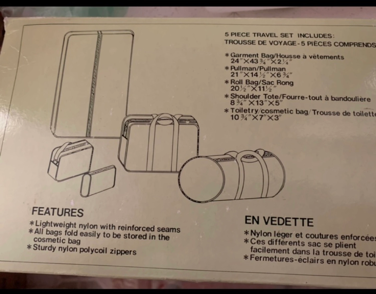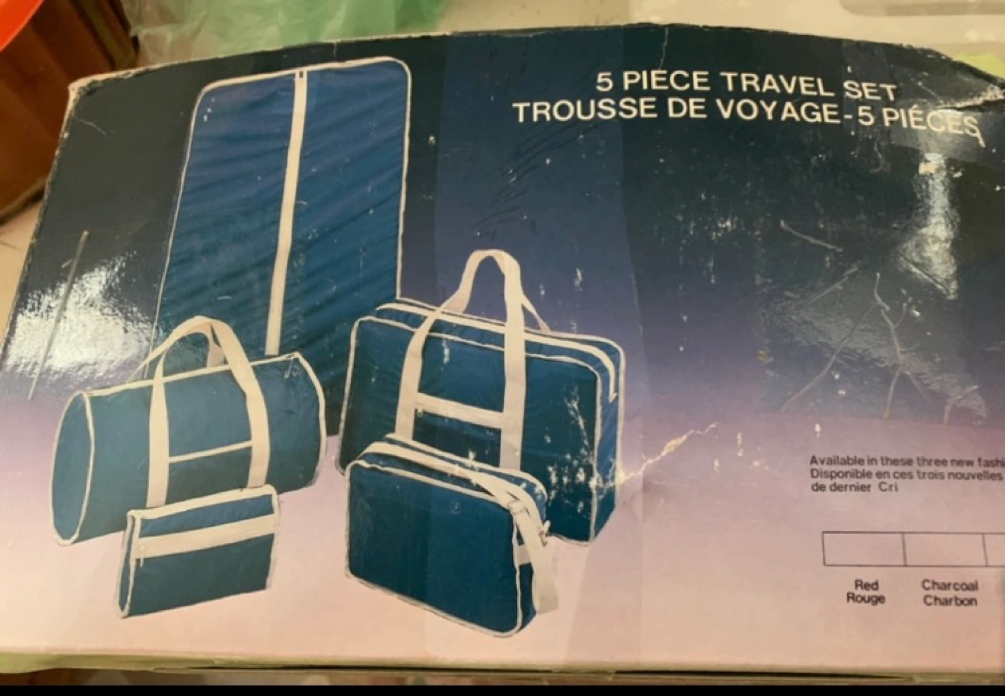 5 piece travel set, includes: Garment bag, Pullman, Roll bag, Shoulder Tote, Toiletry Pouch - dark blue material and straps (NOT white as shown on the packaging - see last photos)
