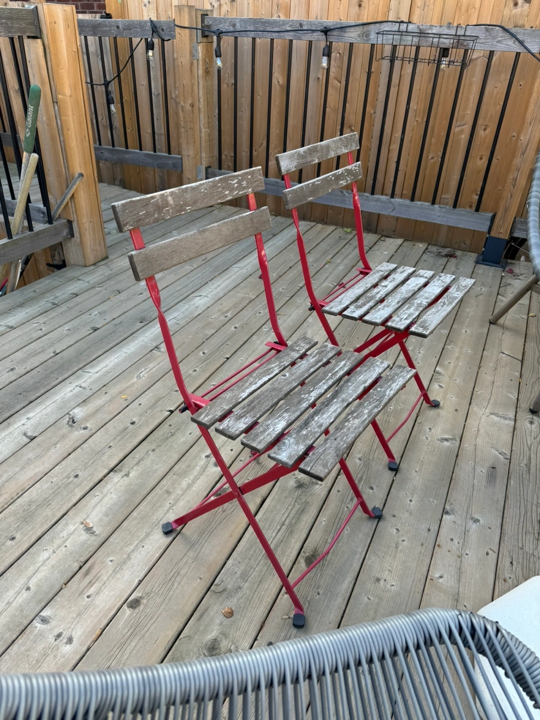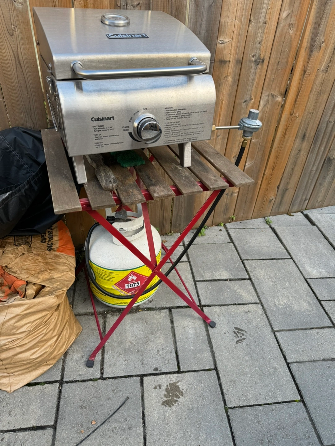 Stainless steel tabletop grill. Includes propane tank and hose. Willing to throw IKEA bistro set in for the right price.