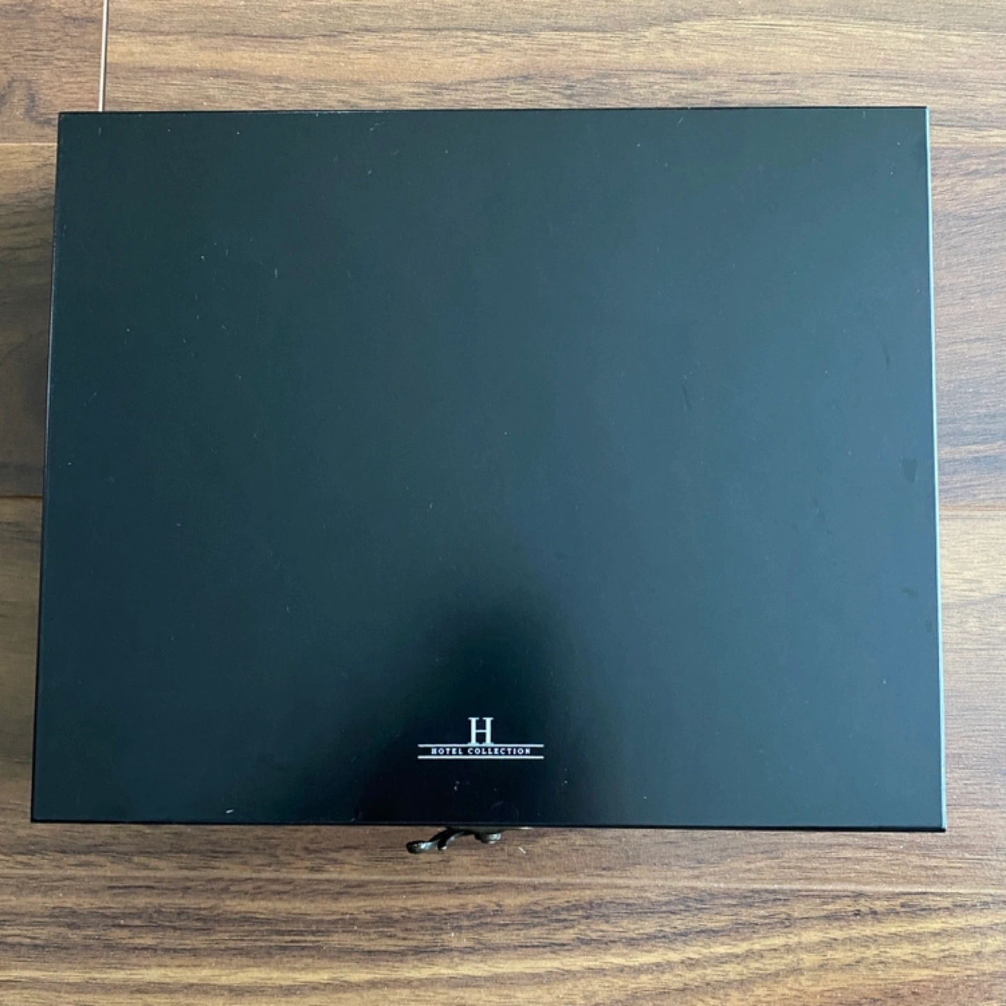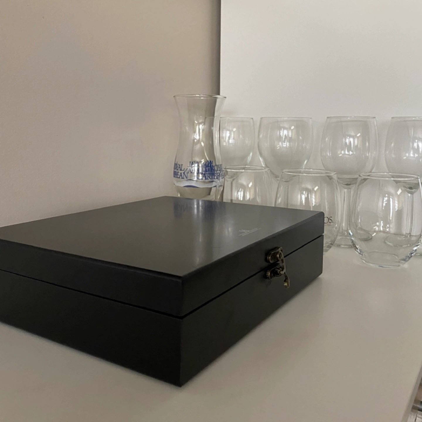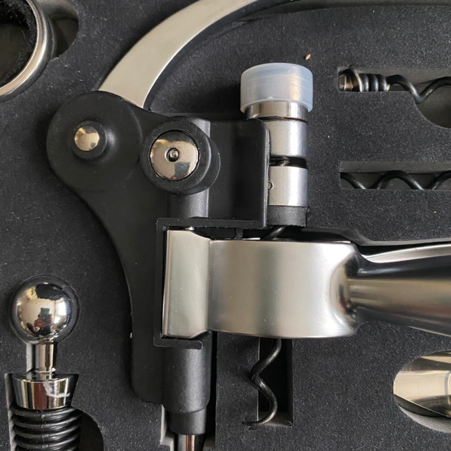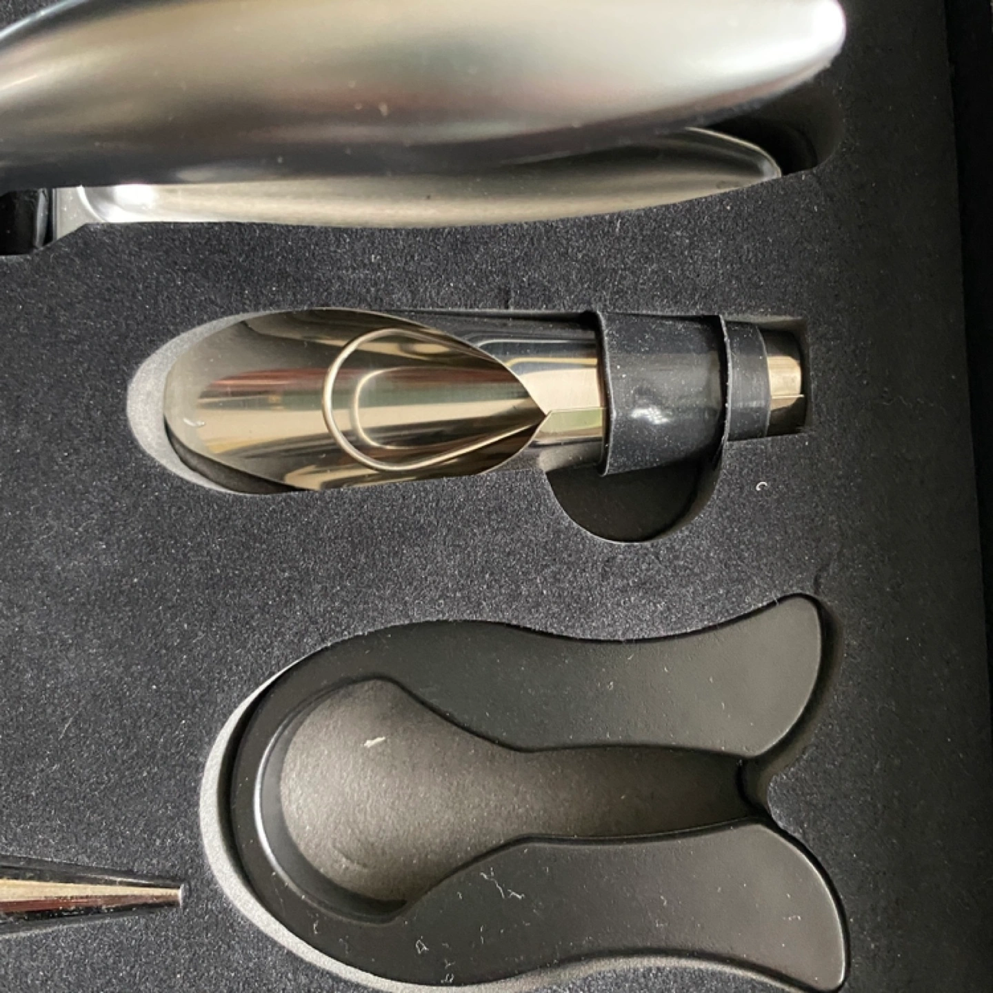 Wine opener set in wooden box. Includes a corkscrew, foil cutter, bottle stopper, and a pourer. 9 pieces. New.