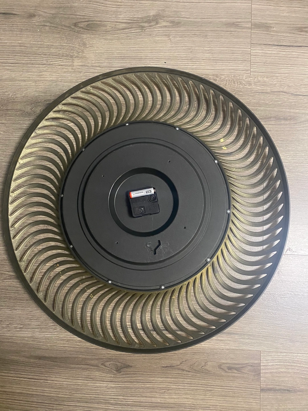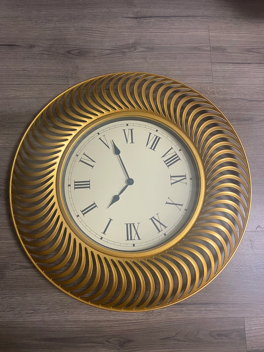 Gold wall clock with Roman numerals and a decorative frame. Requires one AA battery.