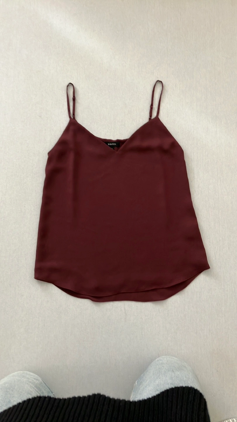Burgundy cami top with a v-neck. Sleeveless with thin straps. Made of 100% polyester.