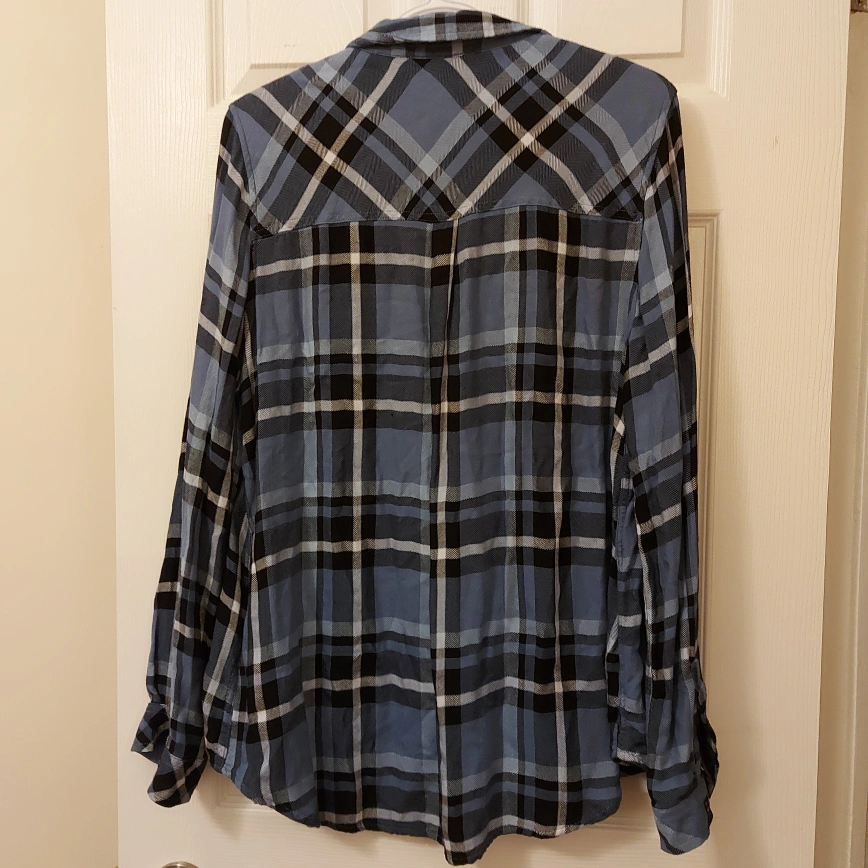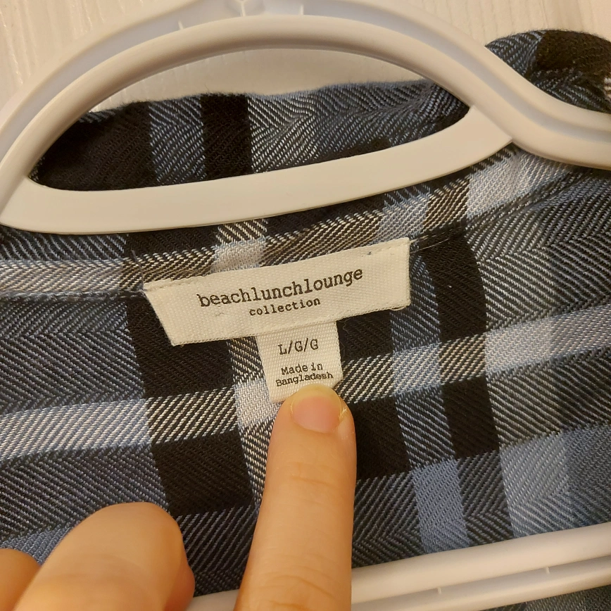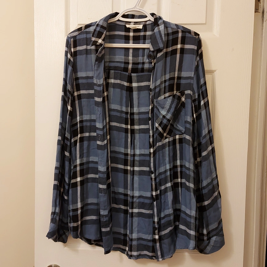 Long-sleeved button-down shirt with a plaid pattern. Size L/G. Made in Bangladesh. Worn once or twice but just been sitting in my closet forever.