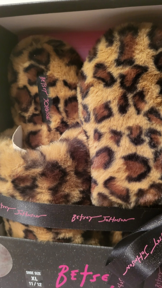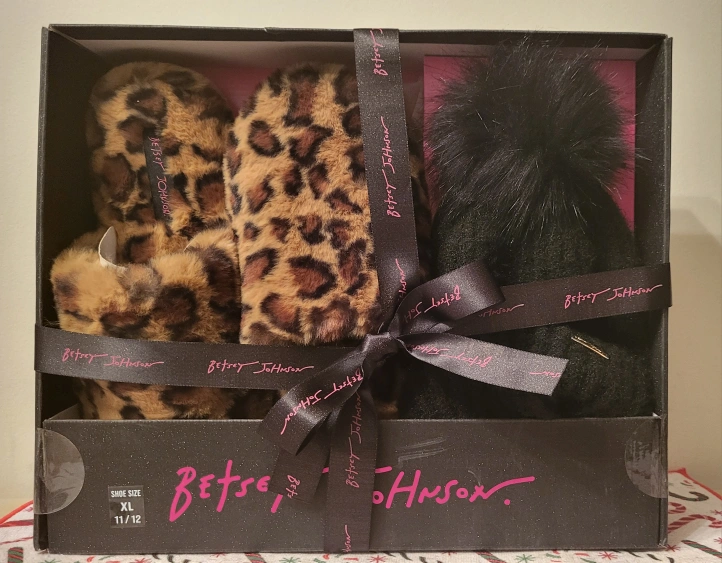 ✨️This brand new Betsey Johnson gift set is the perfect combo to keep you cozy and stylish this winter! The set includes a pair of chic leopard print slippers and a cute black pom pom beanie – both items are brand new and never opened, still sealed in their original gift box.