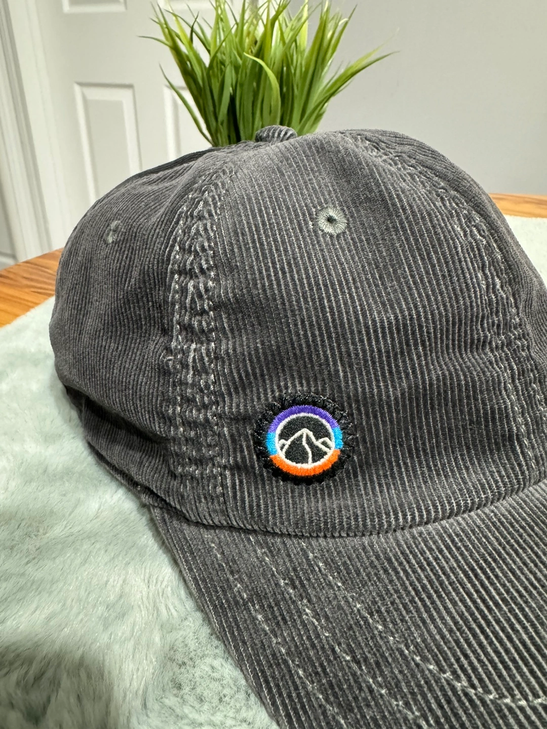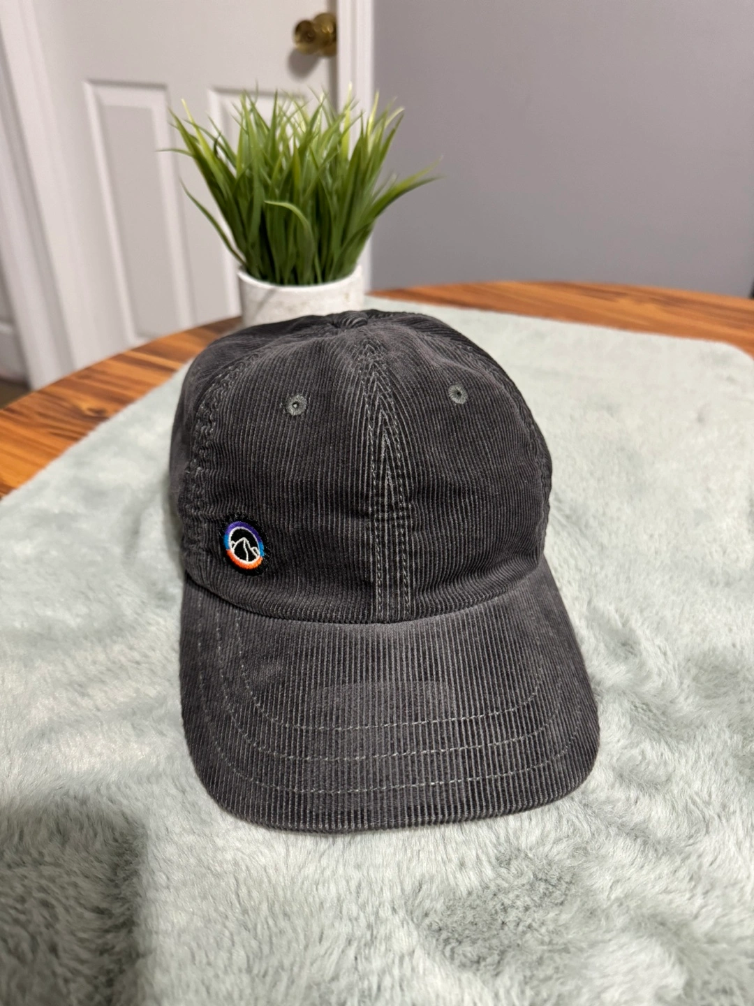 Grey corduroy hat with a small embroidered patch on the front. Adjustable strap in the back.