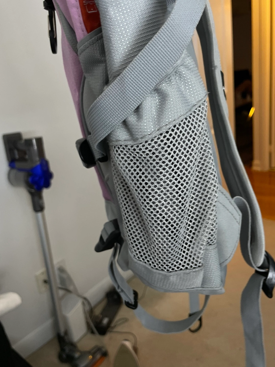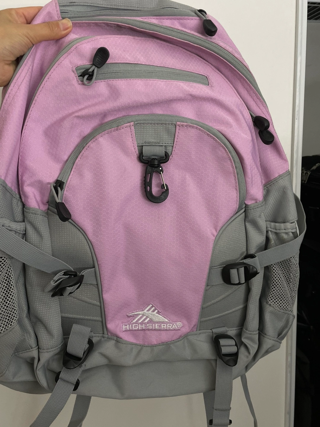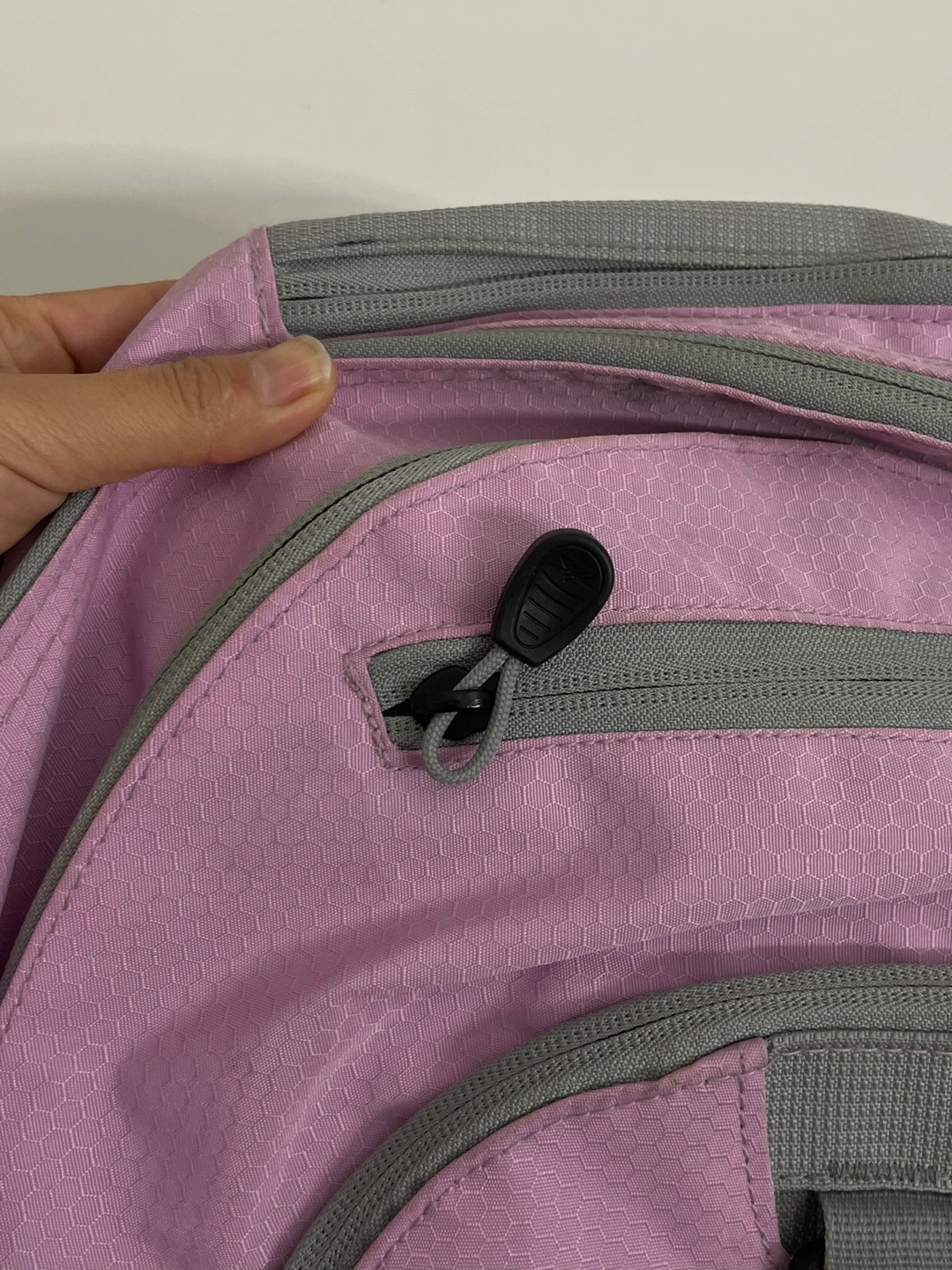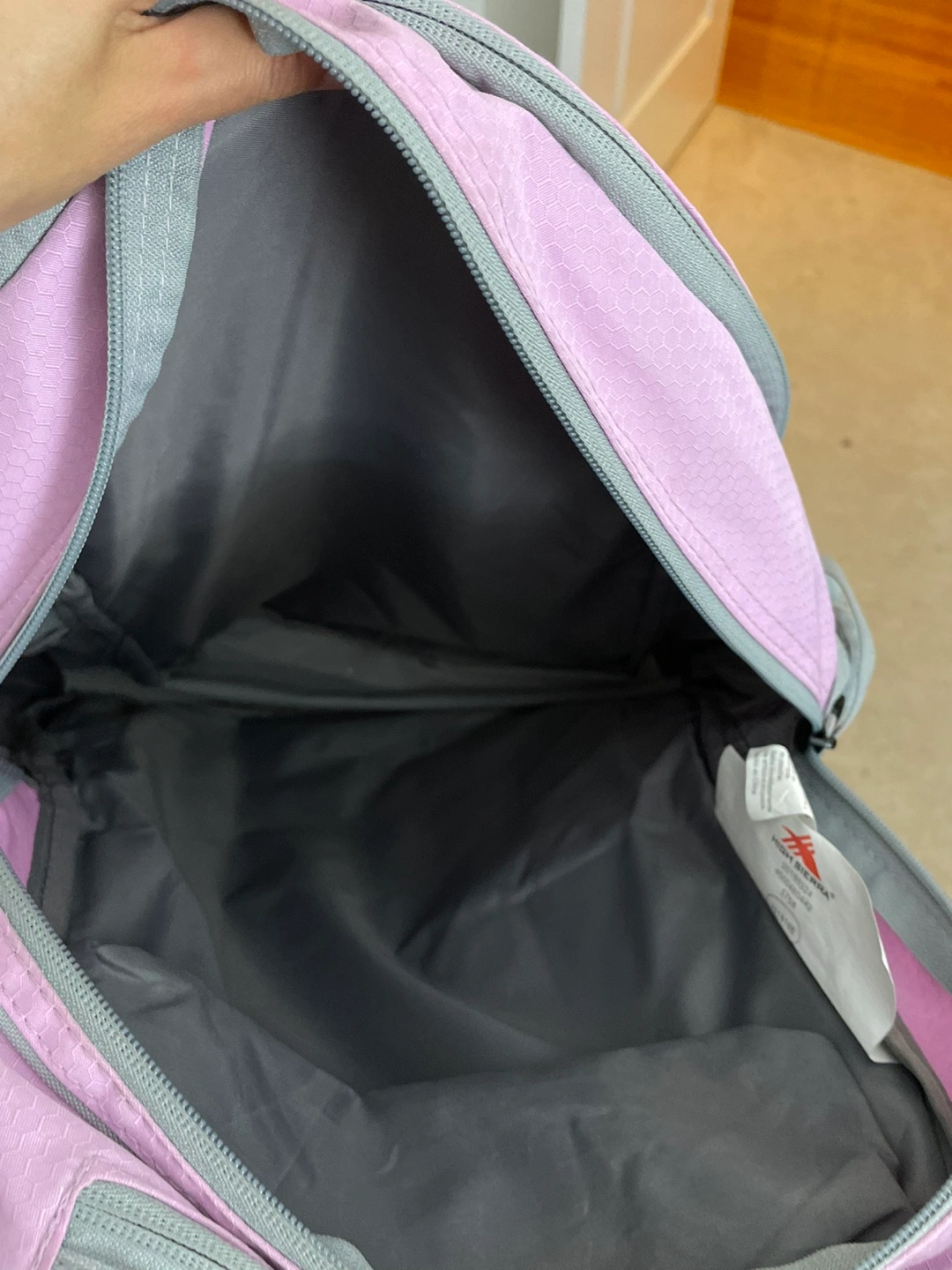 1000+Purple and grey backpack with multiple pockets. Has a small zippered pocket on the front.