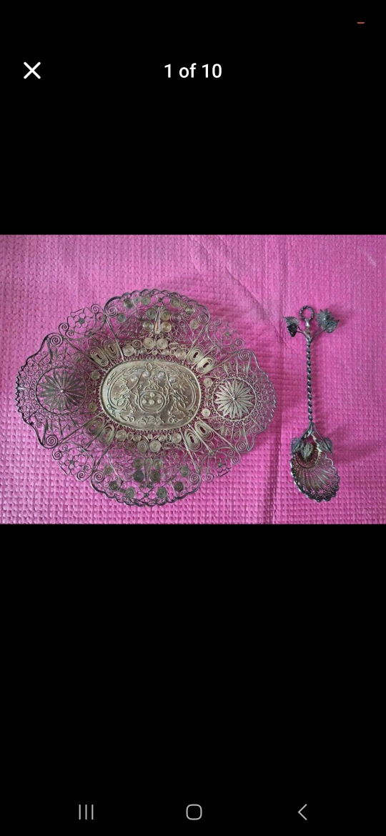 Beautiful antique silver filigree serving dish with a matching serving spoon. The dish is in excellent condition. It has a lovely design of intertwined silver curls with a central oval and floral accents. The spoon is similarly adorned with swirls and a leaf design.
