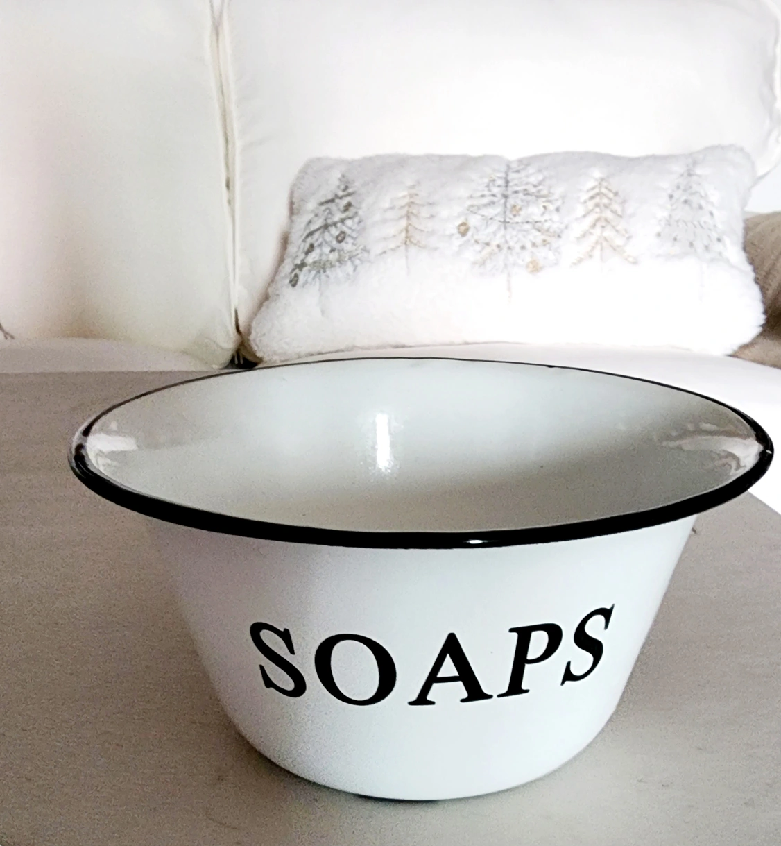 This french country soap bowl dish is a perfect accessory to your farmhouse bathroom or kitchen decor. Would also make a terrific gift for any occasion or holiday filled with goodies instead of a basket!