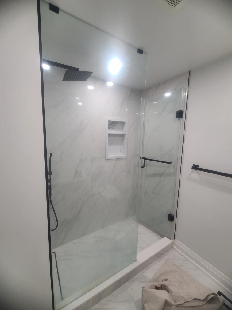 A frameless shower door with black hardware. The door is made of tempered glass and has a single handle on the inside. It also includes a towel bar. The door is in good condition and comes with all the necessary hardware for installation. already removed