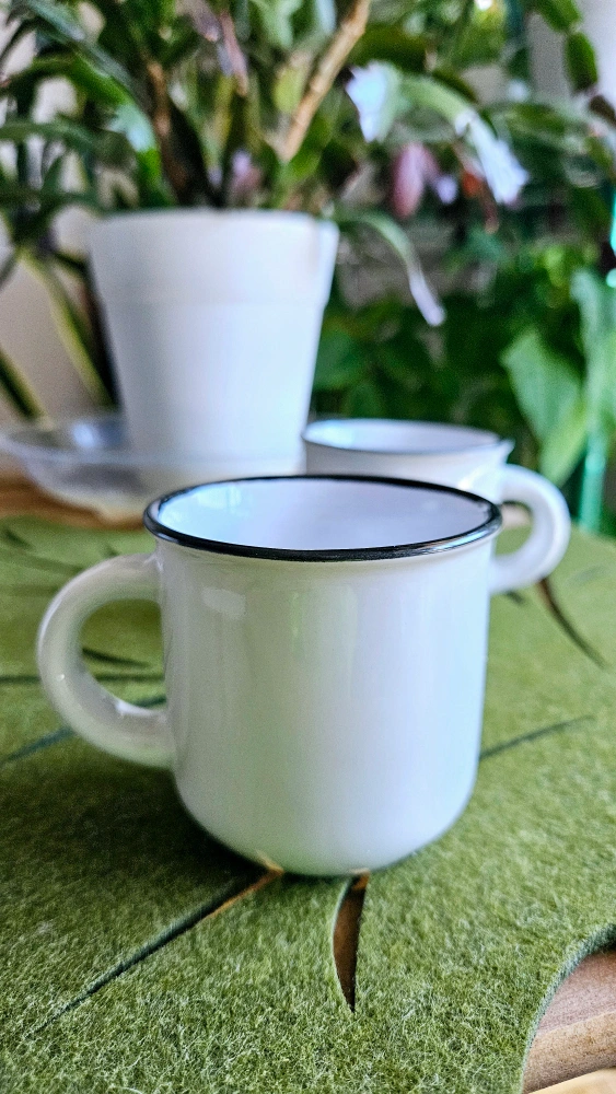 White mugs with black rims. Small size, perfect for espresso or tea.