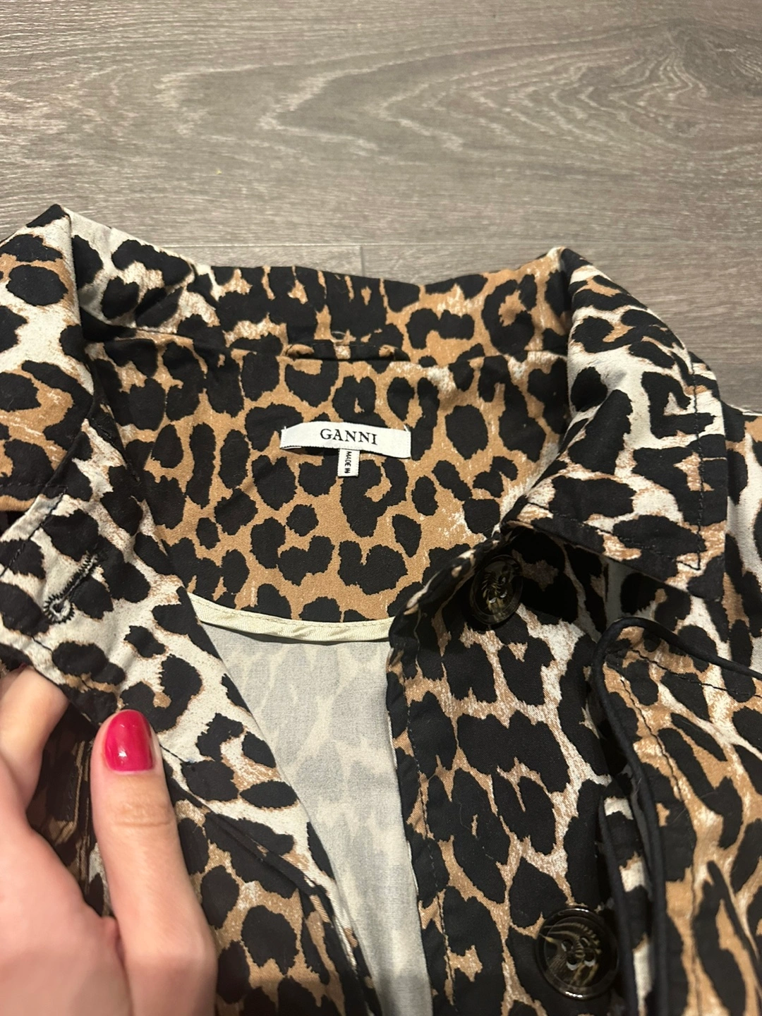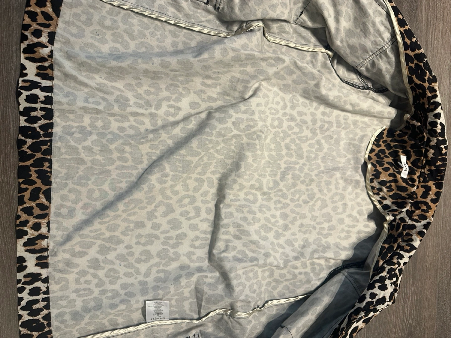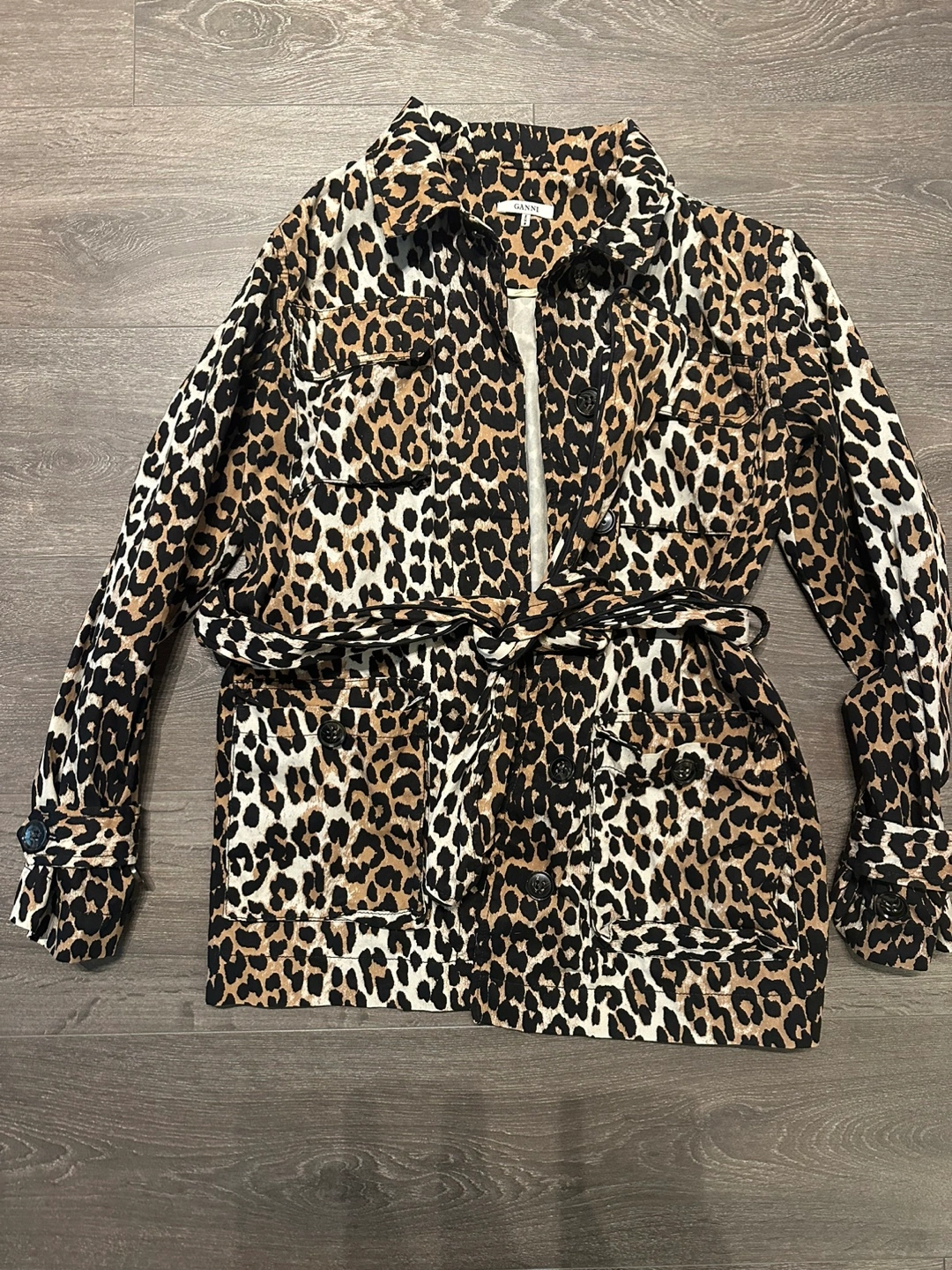 Authentic Ganni Leopard print jacket with a tie waist. pockets on the front.