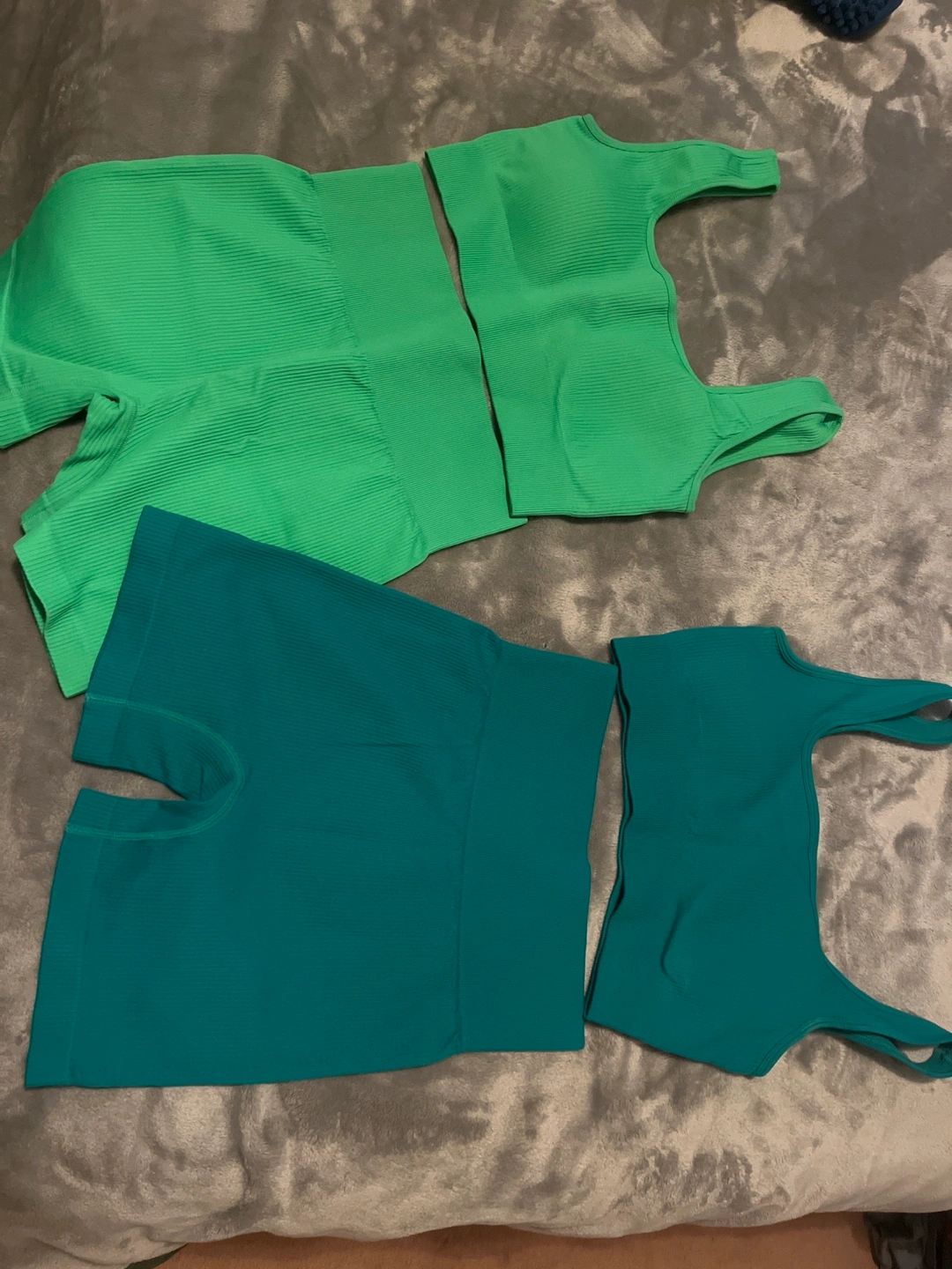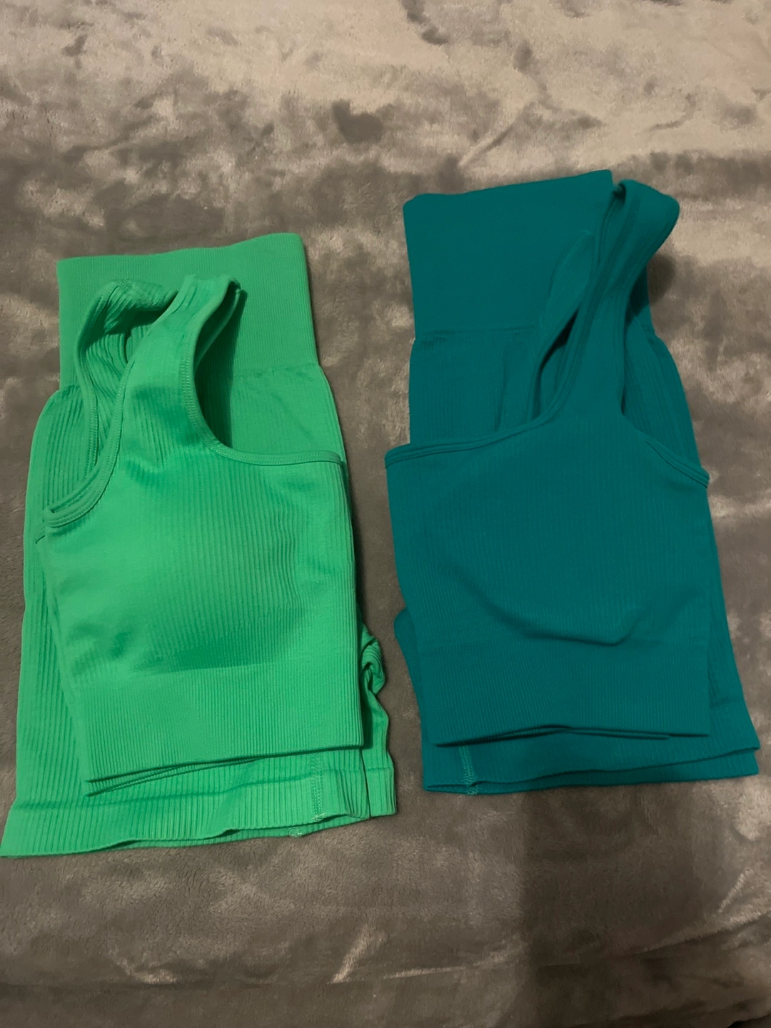 Two sets of workout wear. Green and teal sets. Green is size large and teal is a medium.