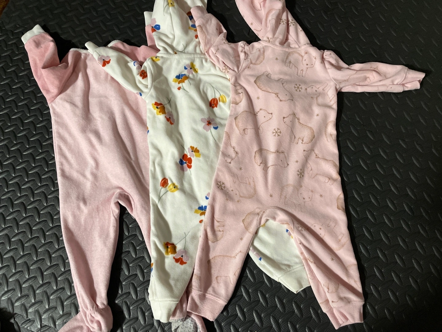 Three pack of baby girl footed pajamas. All are size 12 months. They have long sleeves and a hood. Two are pink and one is white.