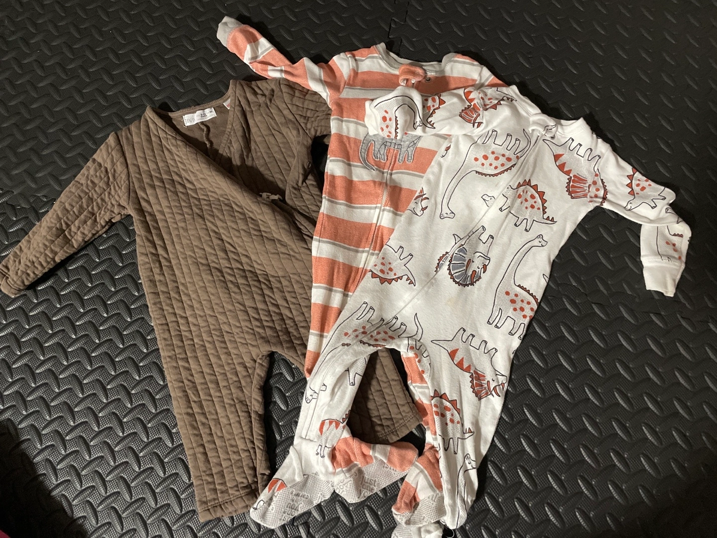 Three baby sleepers. Two with dinosaurs, one brown. All long-sleeved. Great for winter.