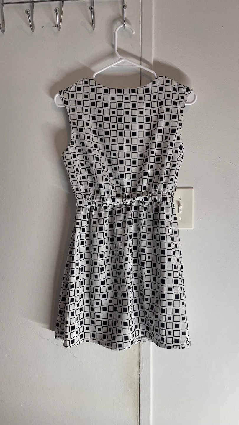Sleeveless, white dress with black squares. Elastic waist.
