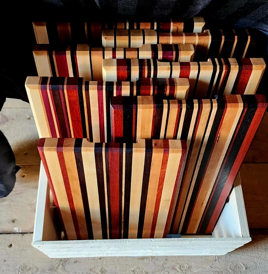 Hand made wooden cutting boards. Striped design. Made of various types of wood.