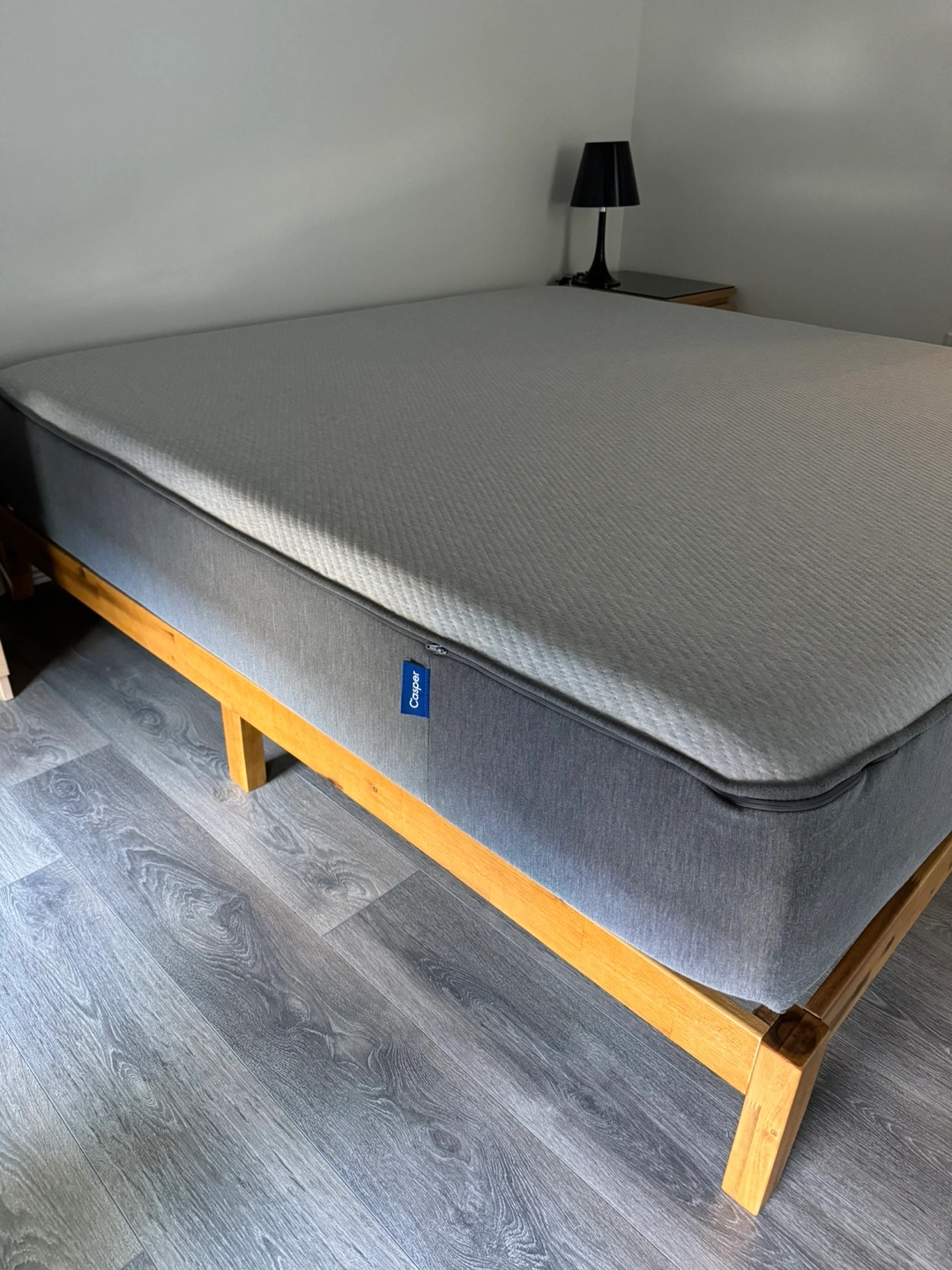 Medium firm, King size mattress. Includes the wooden frame. Includes a blue Casper logo tag.