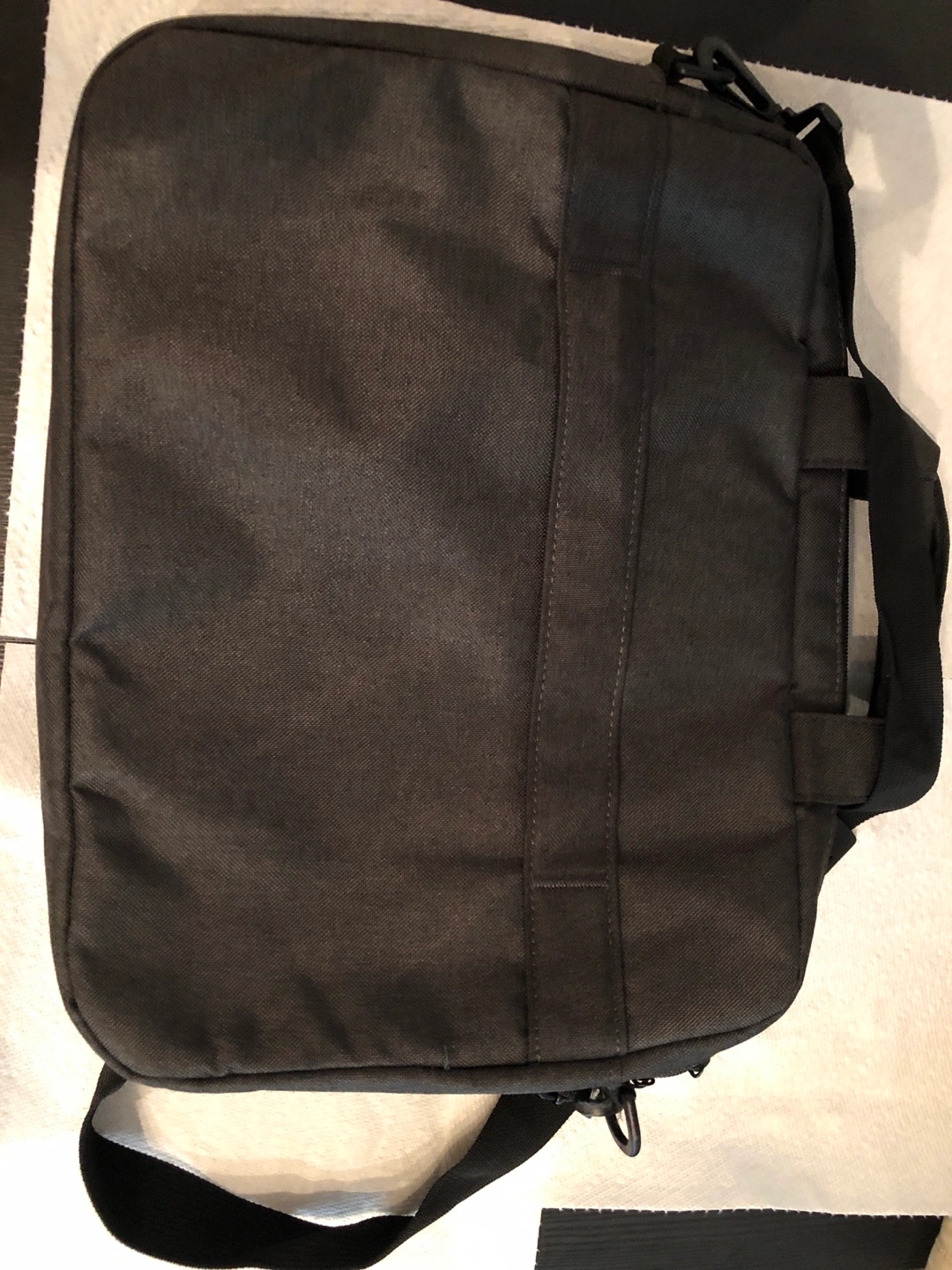 Black laptop bag with an adjustable shoulder strap, top handle, and zippered closure.