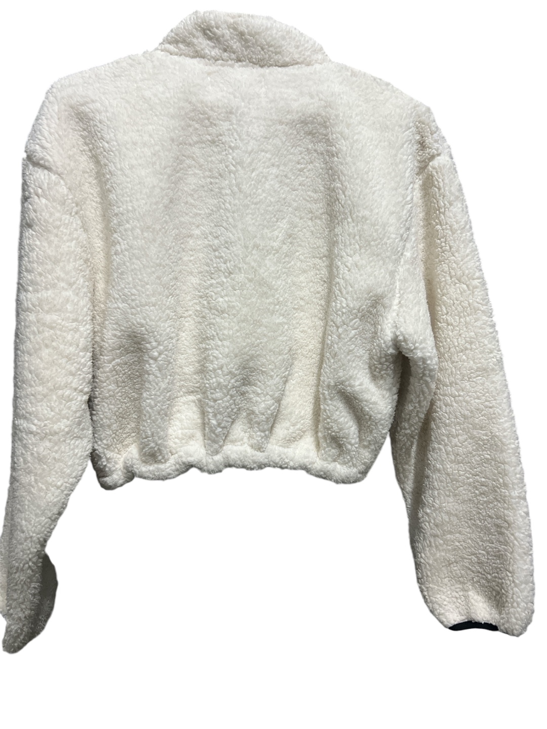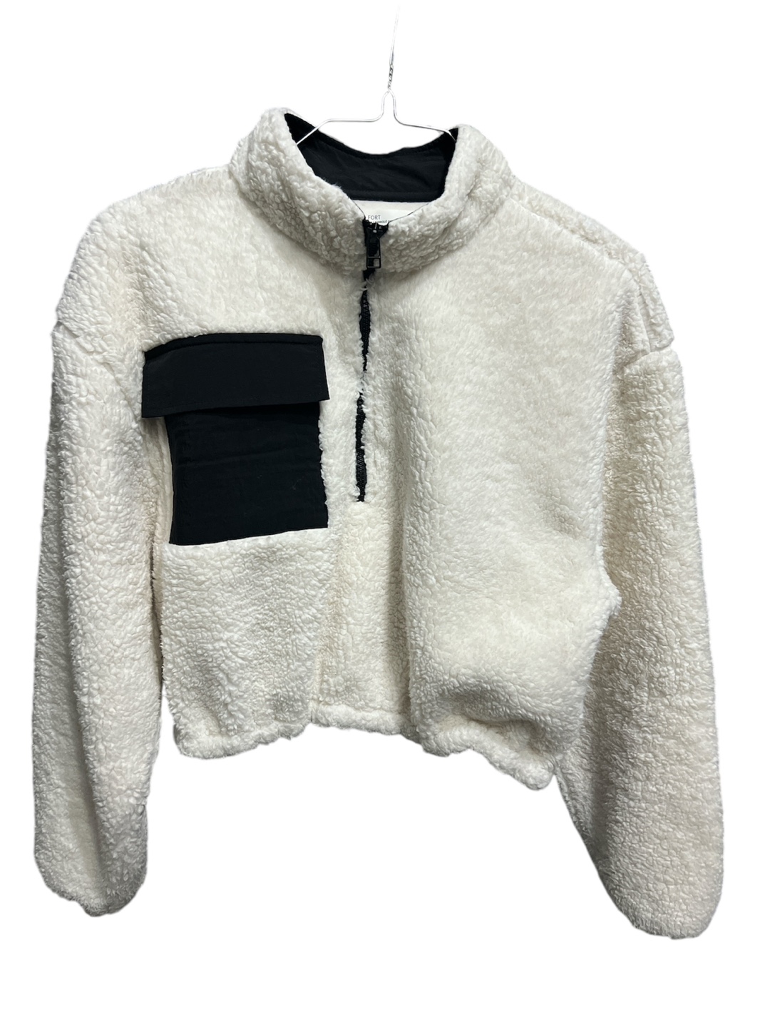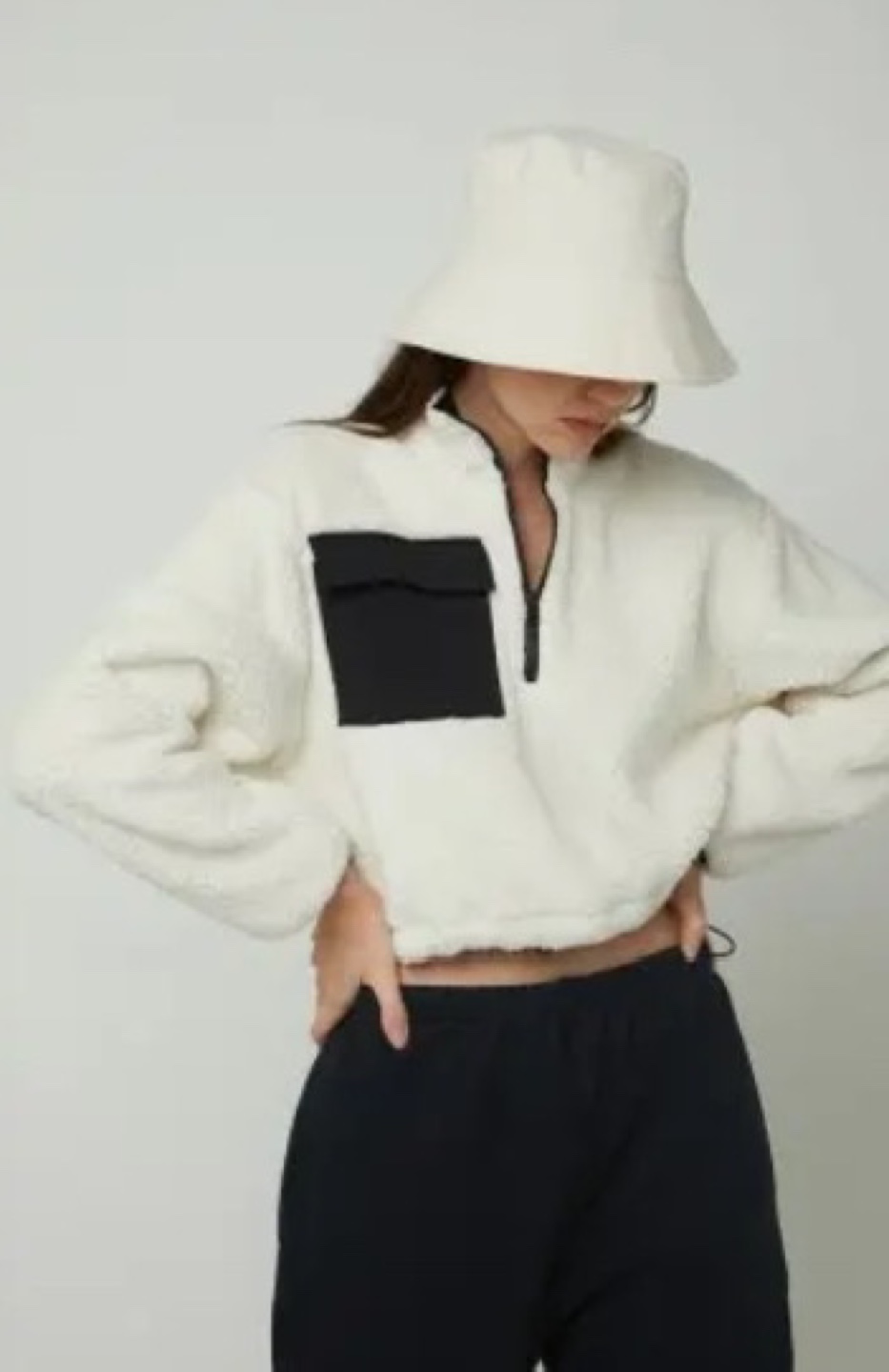 Cream coloured fleece zip up with black pocket detail. Crop top style with elastic waistband. Long sleeves.