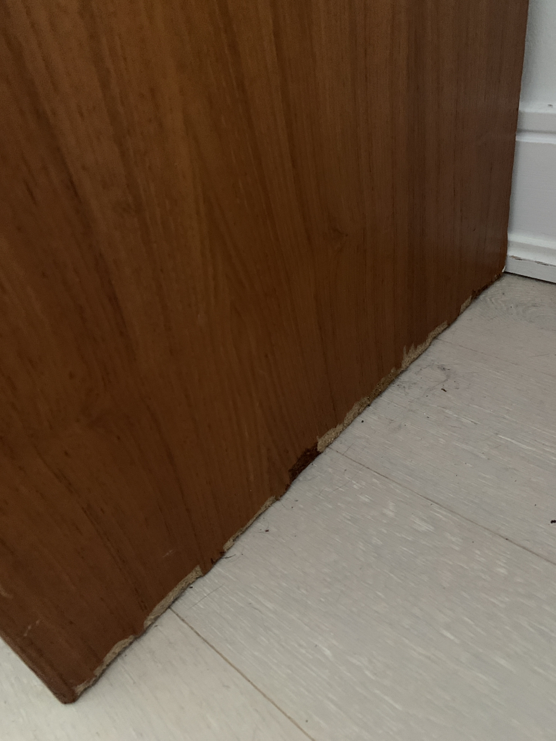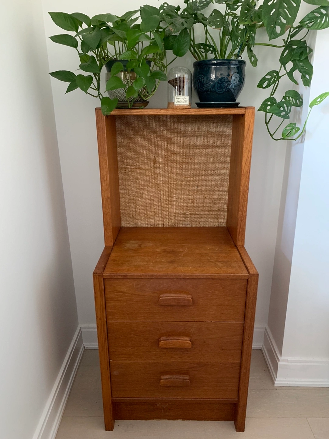 Cute and vintage nightstand with three drawers. It needs to be refreshed/ repainted (the bottom wood is scaled) though it holds perfectly still