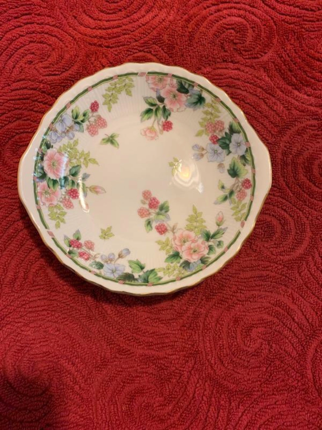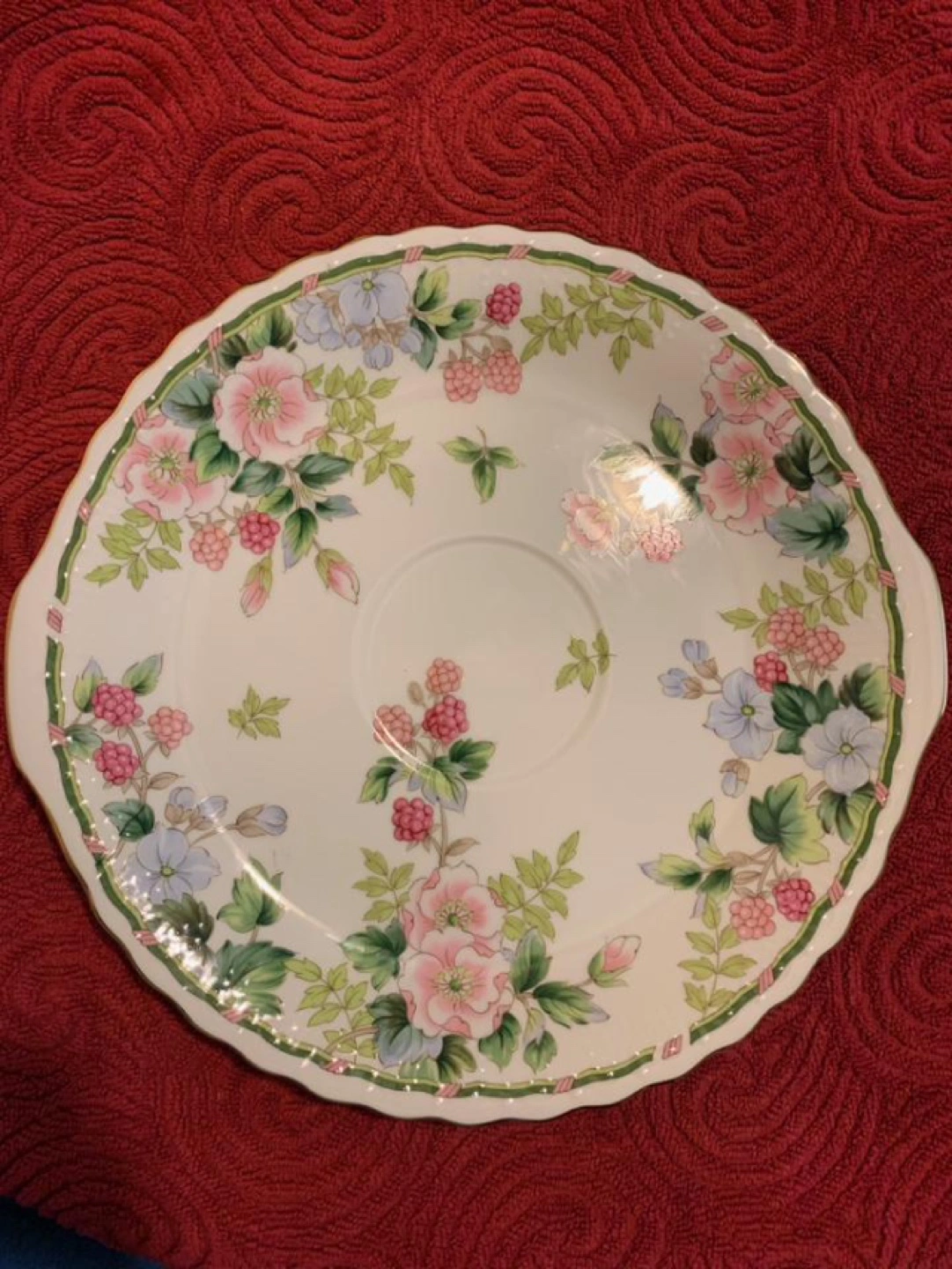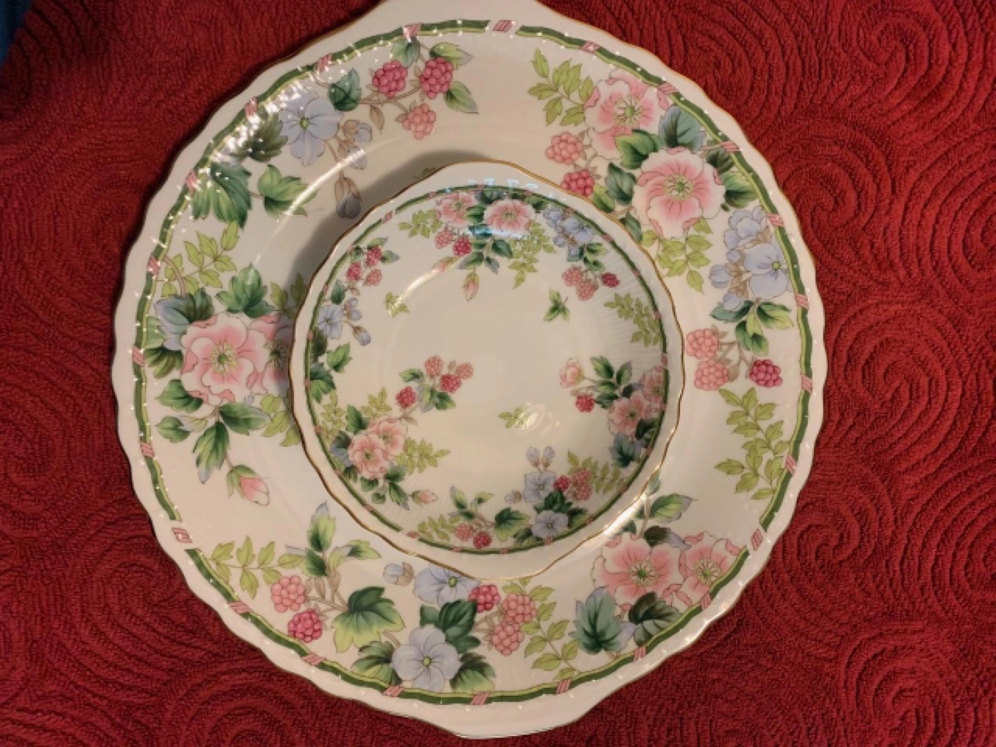 Serving set with two pieces. A large platter with two handles and a smaller bowl. Floral design with gold trim.