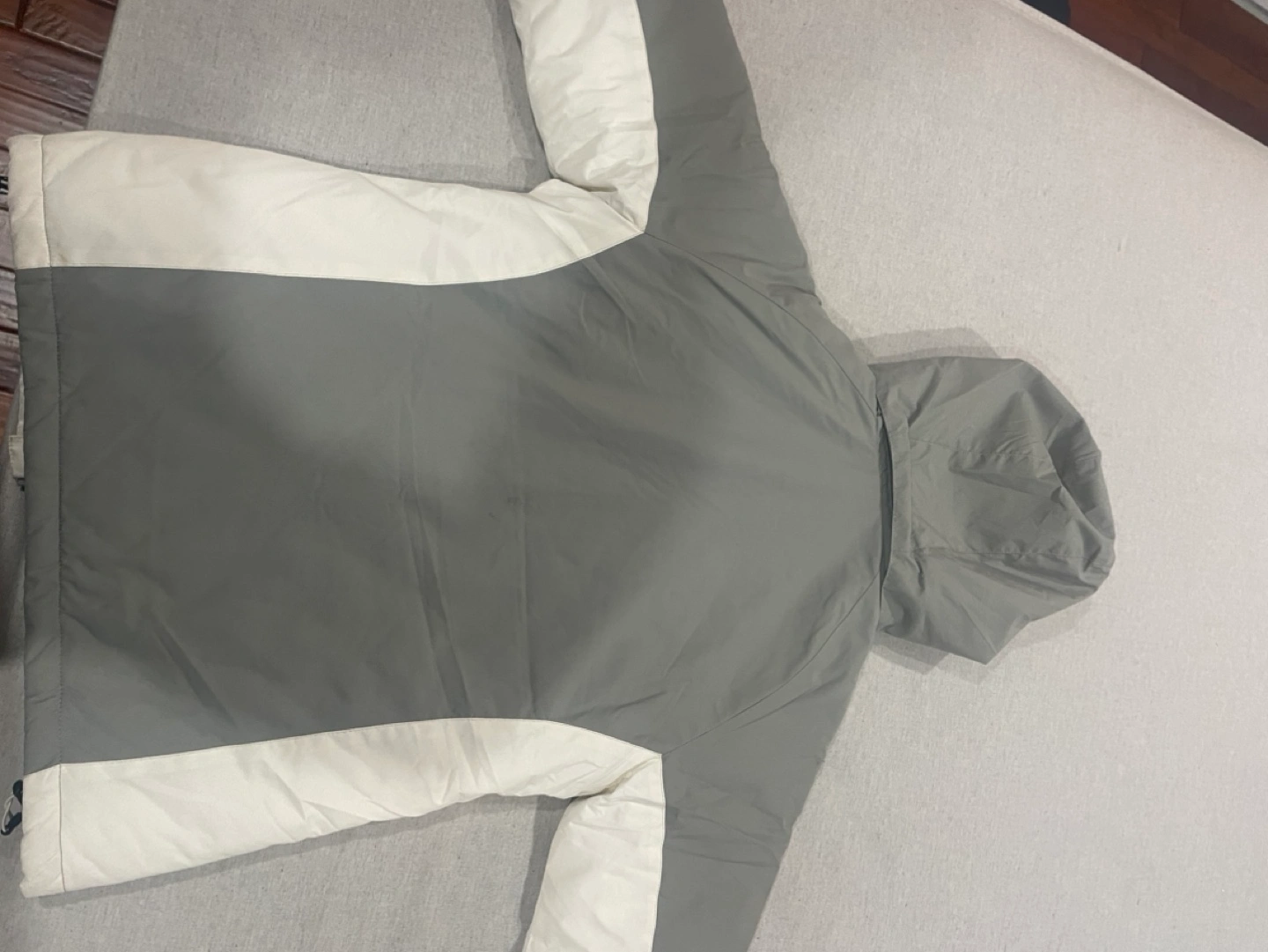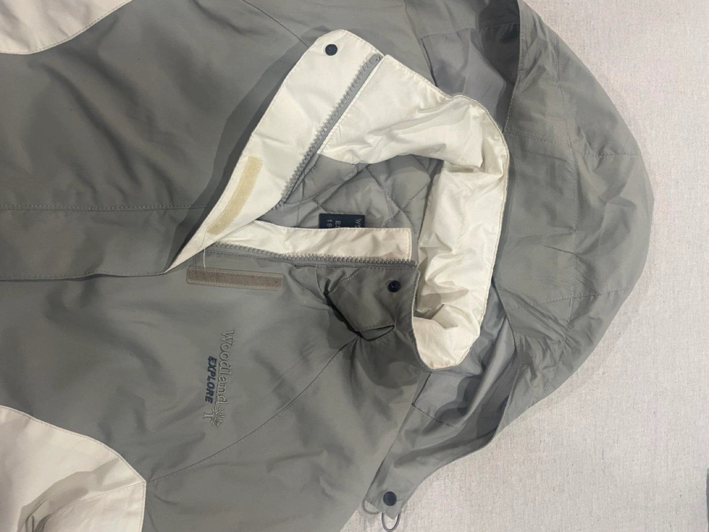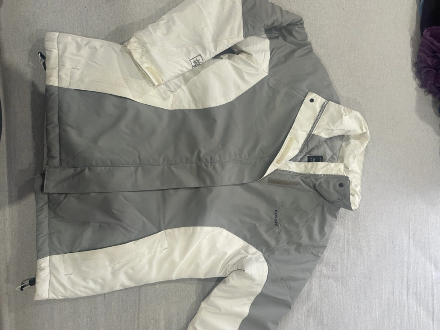 Grey and white ski jacket with a hood. Size small. Zipper and button closure. Clean and great quality. Very warm. Removable hood.